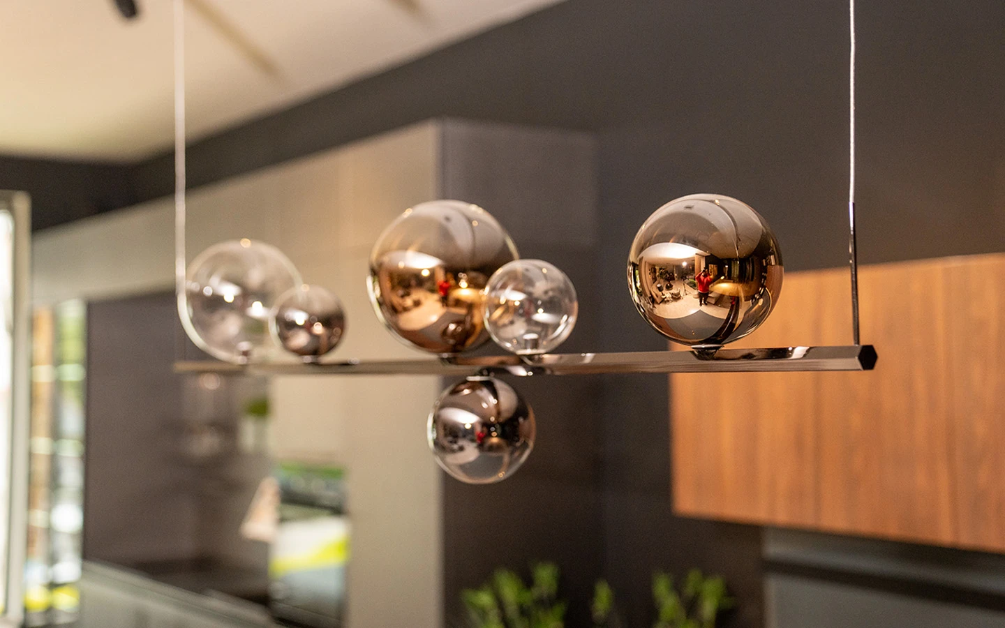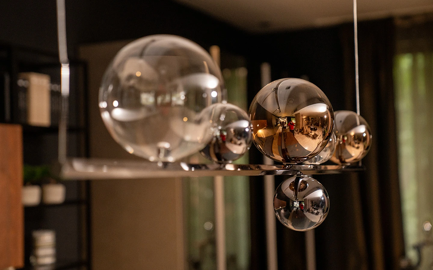 Висящото осветително тяло RANDOM STICK от италианския бранд LODES, дело на дизайнера Chia‑Ying Lee, представлява изтънчен и артистичен модел – хоризонтална шестоъгълна метална лента, върху която са разположени 6 сфери от ръчно стъкло. Вградените LED източници, разположени отдолу по дължината, допълват дифузната светлина на сферите и гарантират равномерно осветление на повърхности под лампата – идеалното решение за маси, кухненски острови или работни зони.