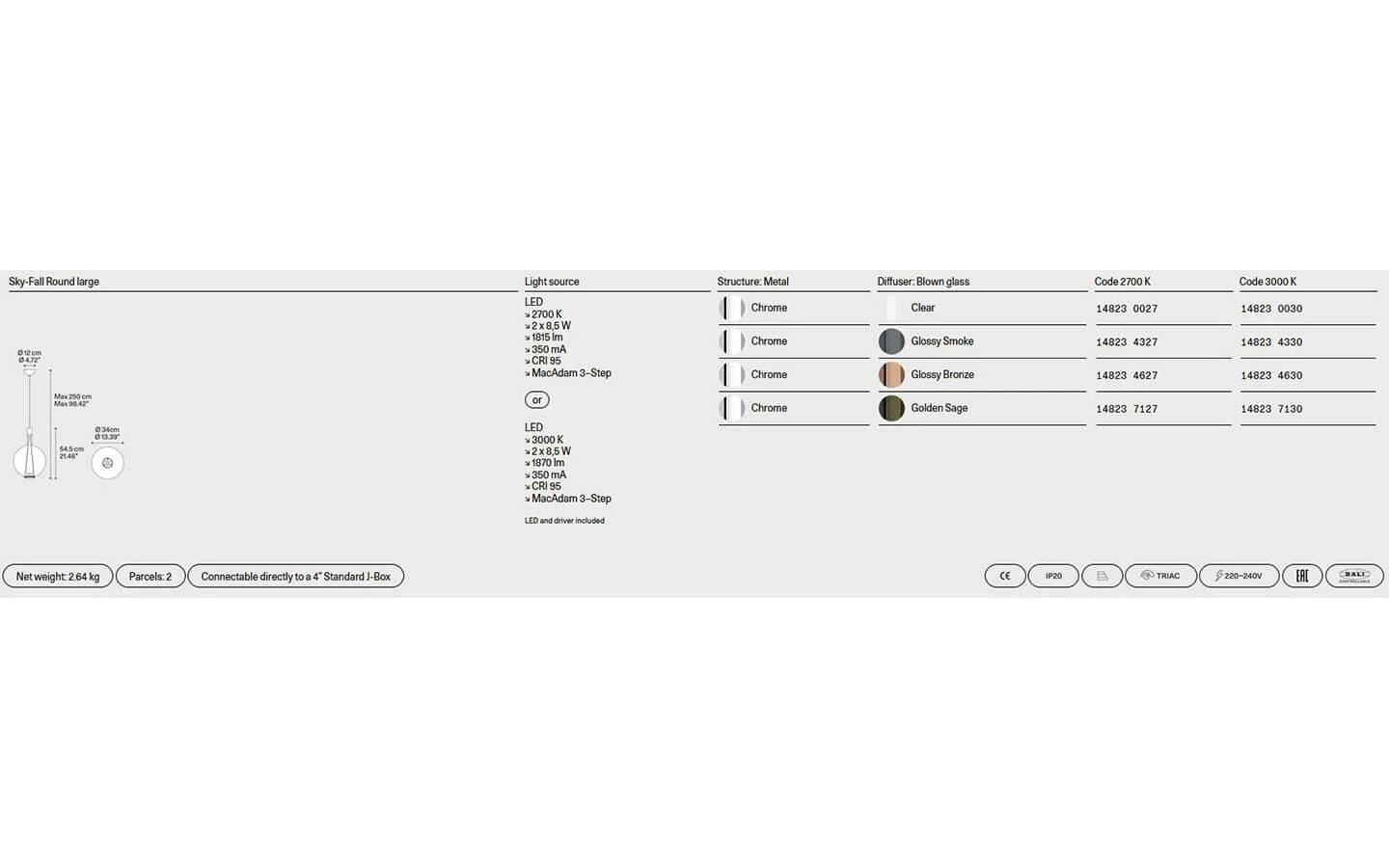 SKY-FALL ROUND е висящо осветително тяло от колекцията на италианския производител LODES. Структурата е изработена от метал – финиш по избор. Дифузерът е изработен от ръчно духано стъкло – финиш по избор. Кабелът може да бъде в цвят Black или Transparent. Цената се определя спрямо избора на размер и финиш на стъклото при дифузера.