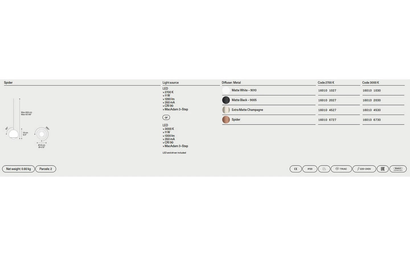 SPIDER е модулно висящо осветително тяло от колекцията на италианския производител LODES. Розетката е изработена от метал – финиш по избор. Структурата е изработена от метал – финиш по избор. Посоката на светлината е регулируема. Цената се определя спрямо избора на конфигурация, вид розетка, финиш на метала при розетката и дифузера.