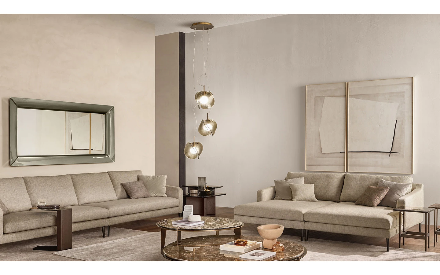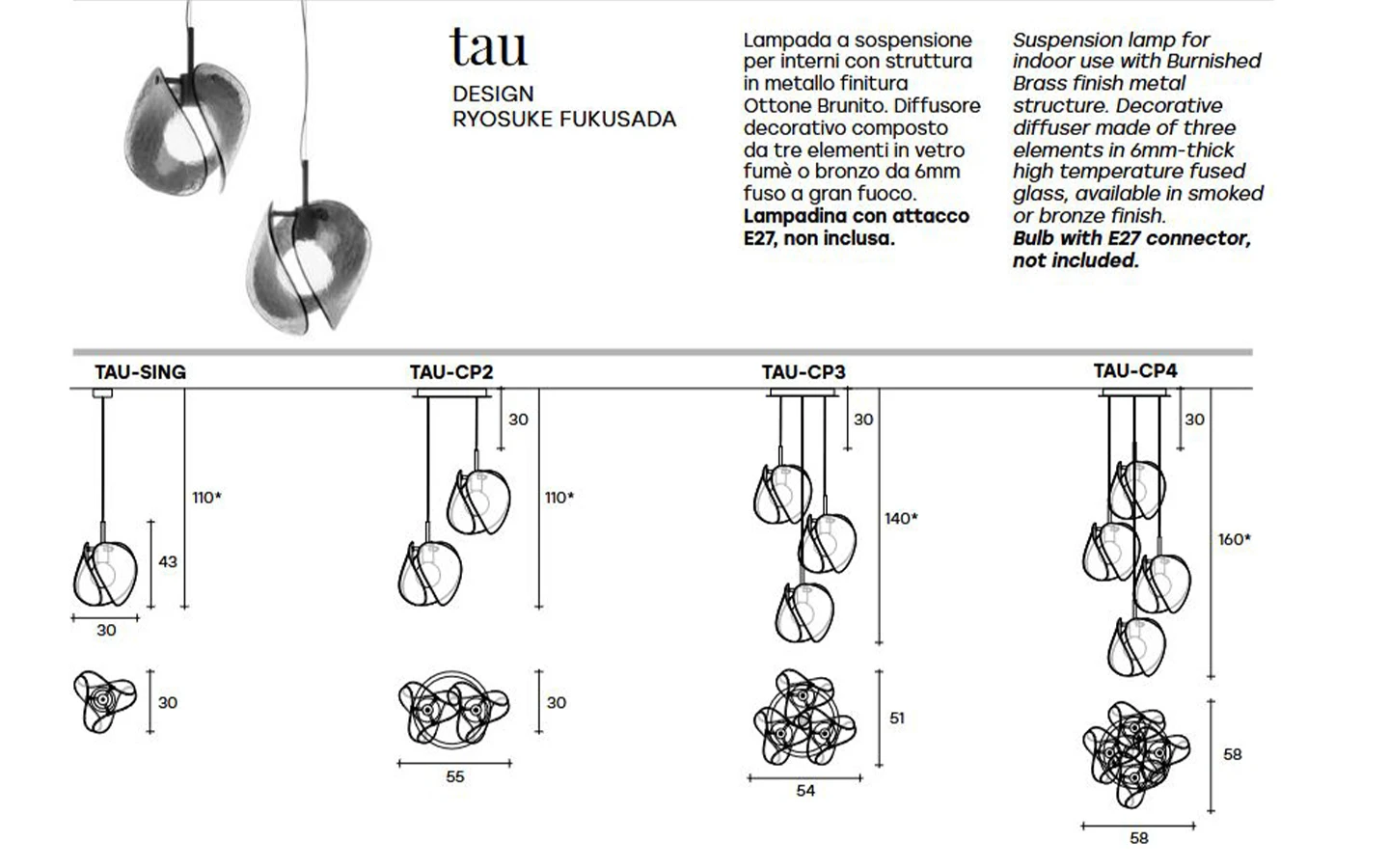 TAU е висящо осветително тяло от колекцията на италианския производител FIAM Italia. Структурата на дифузерът е изработена от метал финиш Burnished brass. Декоративният дифузер има три елемента, изработени от ръчно стъкло – опушено или бронзово по избор. Цената на висящото осветително тяло се формира на база избора на композиция.