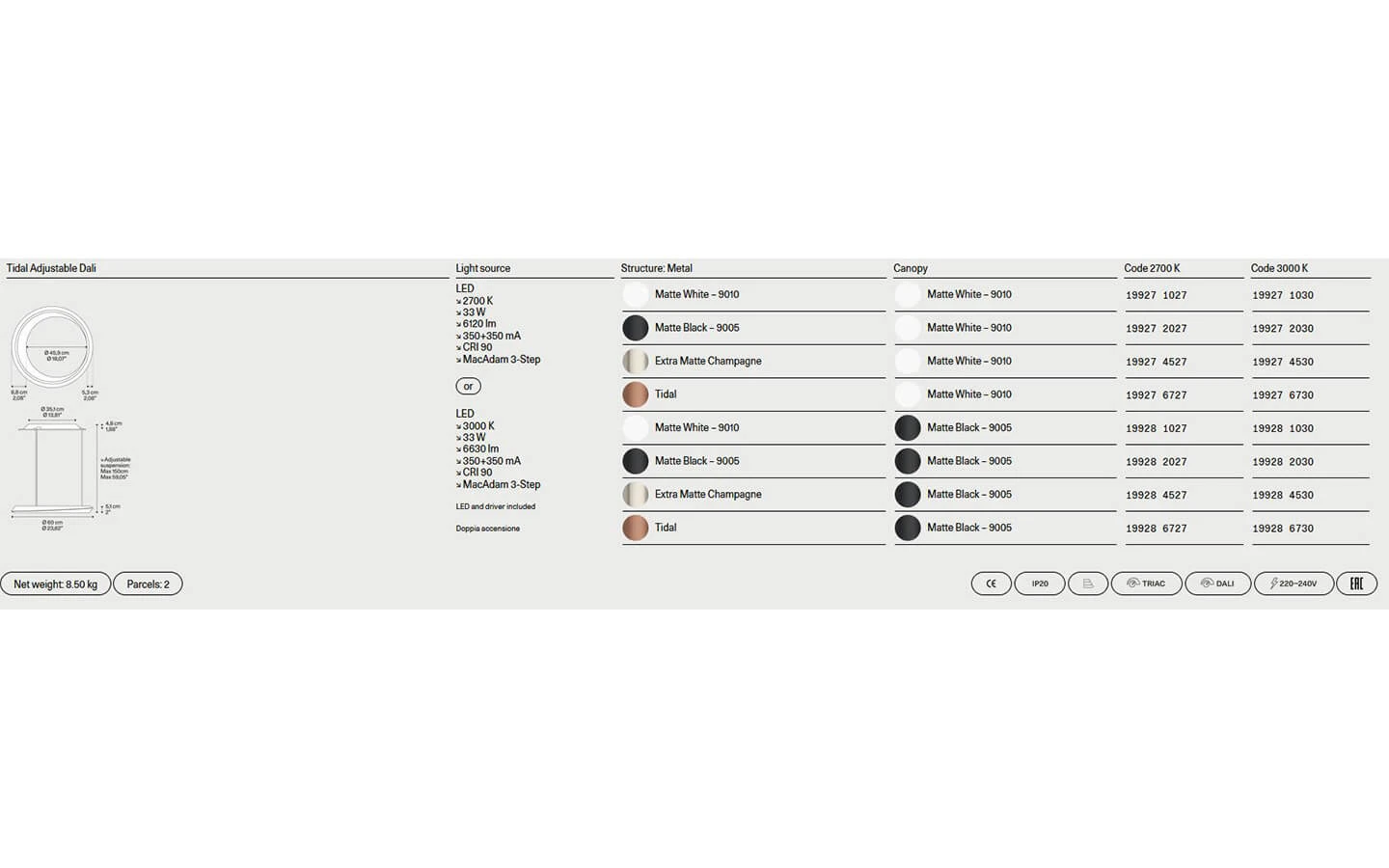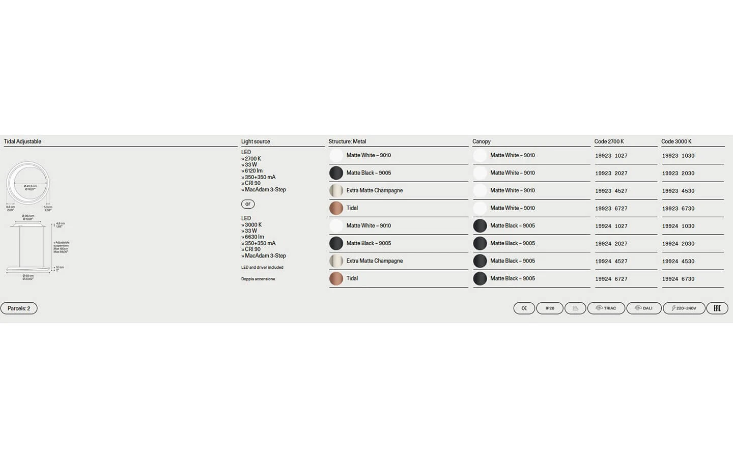 TIDAL е висящо осветително тяло от колекцията на италианския производител LODES. Кръглата розетка е изработена от метал – финиш по избор. Структурата е изработена от метал – финиш по избор. Осветителното тяло се предлага във вариант с възможност за гъвкаво регулиране на височината. Цената се определя спрямо избора на конфигурация и финиш на метала при структурата.