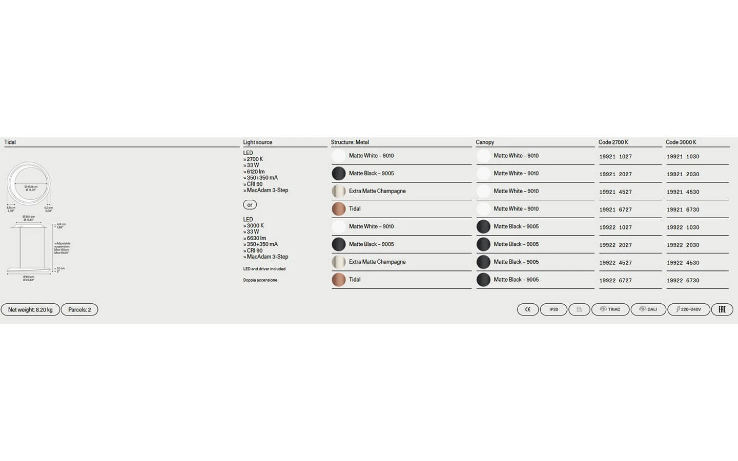 TIDAL от LODES е елегантно висящо осветително тяло с мек и органичен характер, вдъхновен от естествените движения на водата и ритъма на приливите и отливите. Дизайнът се отличава с плавни, заоблени линии и хармонична форма, която създава усещане за спокойствие и баланс в пространството. Светлината се разпръсква равномерно и деликатно, като оформя топла и обгръщаща атмосфера без резки контрасти и отблясъци. TIDAL е проектирана така, че да бъде едновременно функционален източник на светлина и фин декоративен акцент, който не доминира, а допълва интериора. Подходяща е за жилищни пространства като трапезарии, дневни и спални, както и за елегантни обществени интериори – ресторанти, хотели и бутикови пространства, където светлината трябва да създава усещане за комфорт и емоция. Комбинацията от изчистен дизайн, висококачествени материали и съвременна LED технология превръща TIDAL в стилно и балансирано осветително решение с подчертана италианска естетика.