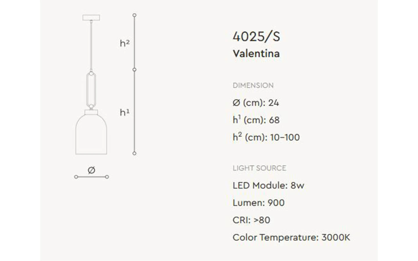 Висящото осветително тяло VALENTINA на италианския бранд ITALAMP е съвременно и деликатно интерпретирано бижу от колекцията Generale, в което светлината среща мекотата на формата и елегантността на детайла. Създадена от дизайнерите Simone Bretti и студиото THDP, лампата съчетава изчистена метална структура в златен или графитен финиш с прецизно издухан стъклен дифузер в ефирни нюанси – червено, пушено сиво или Agata. Формата ѝ напомня леко заоблен купол, който създава усещане за баланс, лекота и изтънченост. Вграден LED модул осигурява топла, равномерна светлина с отличен цветови индекс, подходяща за създаване на уютна и обмислена атмосфера. VALENTINA е идеална както за самостоятелно поставяне, така и в серия над бар плот, трапезна маса или в хотелски и жилищни пространства, където се търси хармония между форма, материал и светлина. Тя не е просто лампа – тя е тих жест на стил, който остава.