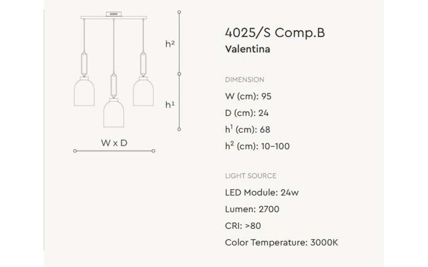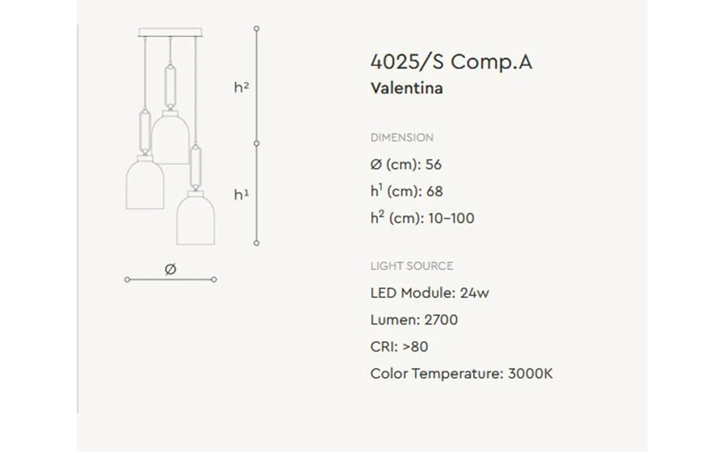 VALENTINA е висящо осветително тяло от колекцията на италианския производител Italamp. Осветителното тяло се предлага в различни конфигурации. Структурата e изработена от метал – финиш по избор. Дифузерът е изработен от стъкло – финиш по избор. Цената се определя спрямо избора на конфигурация.
