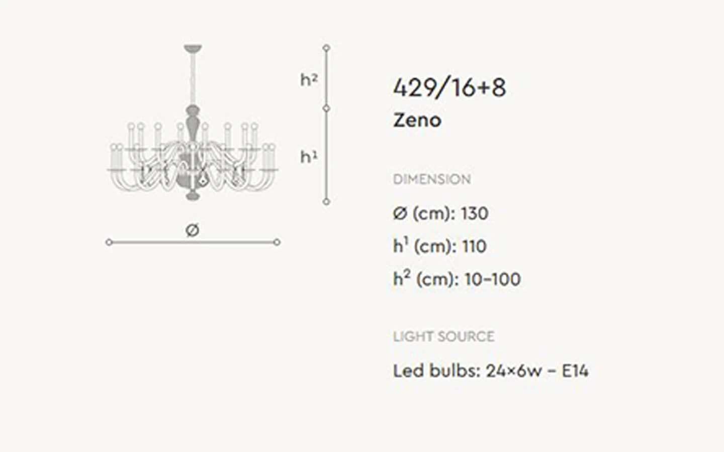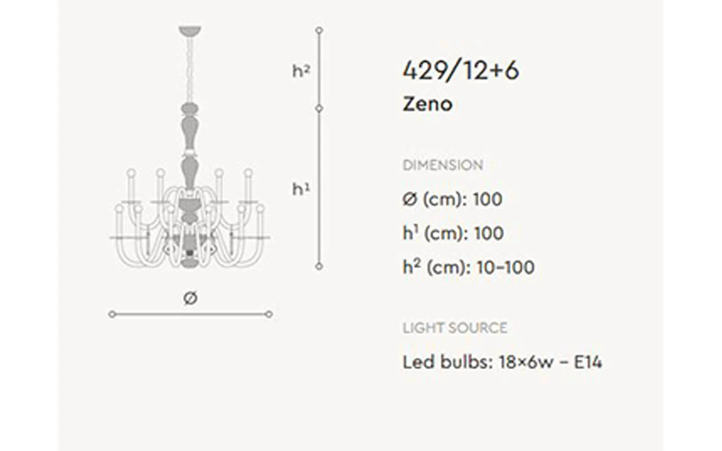 ZENO е висящо осветително тяло от колекцията на италианския производител Italamp. Осветителното тяло се предлага в различни конфигурации. Структурата e изработена от метал – финиш Shiny Nickel. Декоративните детайли са изработени от прозрачен ръчно гравиран кристал. Централни елементи са изработени от гравиран кристал. Декоративен диск, изработен от кристал – финиш по избор. Цената се определя спрямо избора на конфигурация.