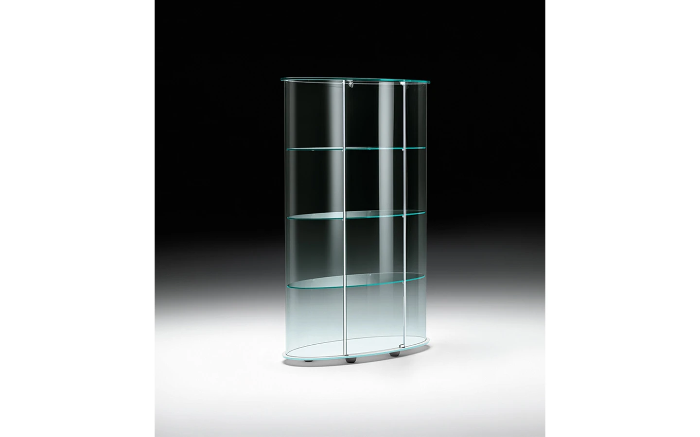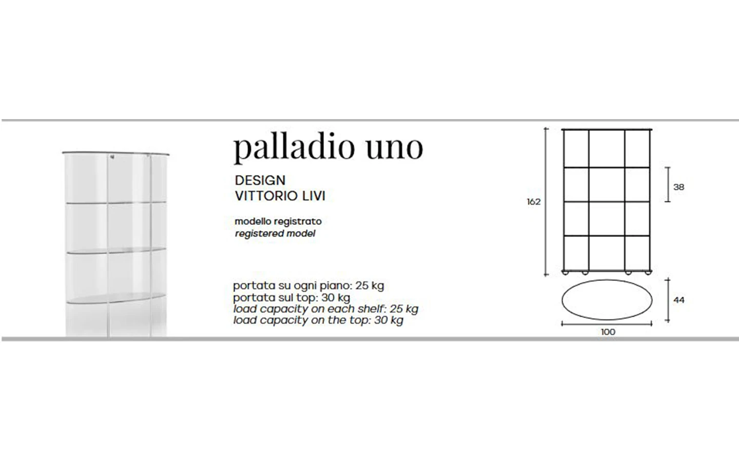 PALLADIO UNO е италианска витрина от колекцията на италианския производител FIAM Italia. Витрината е изработена от извито стъкло. Основата е от стъкло – огледално, цвят black, цвят white или от дърво – финиш Walnut Canaletto. Структурата е изработена от метал. Профилите са изработени от лъскав алуминий. Опционално може да се вгради LED осветление. Цената се определя спрямо избора на материал и финиш на основата.