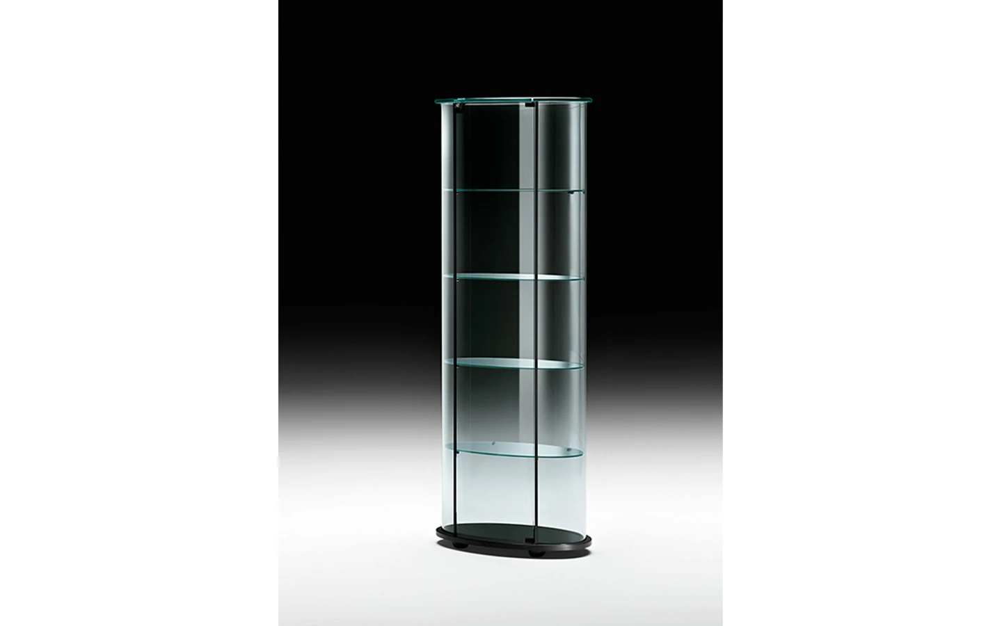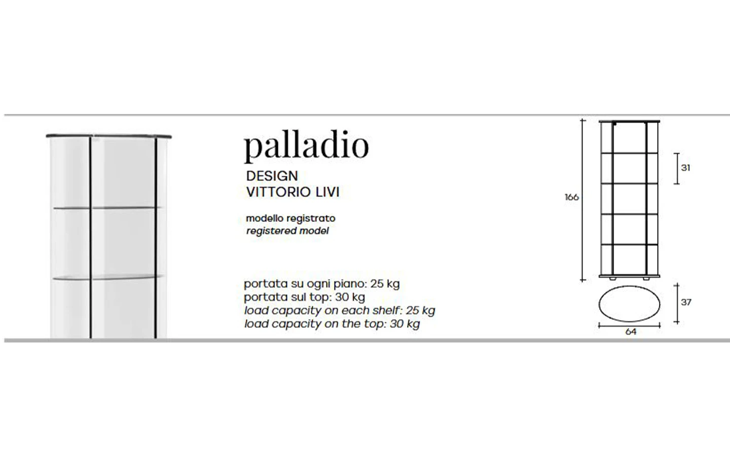 PALLADIO е италианска витрина от колекцията на италианския производител FIAM Italia. Витрината е изработена от извито стъкло. Основата е от стъкло – огледално, цвят black, цвят white или от дърво – финиш Walnut Canaletto. Структурата е изработена от метал. Профилите са изработени от лъскав алуминий. Опционално може да се вгради LED осветление. Цената се определя спрямо избора на материал и финиш на основата.