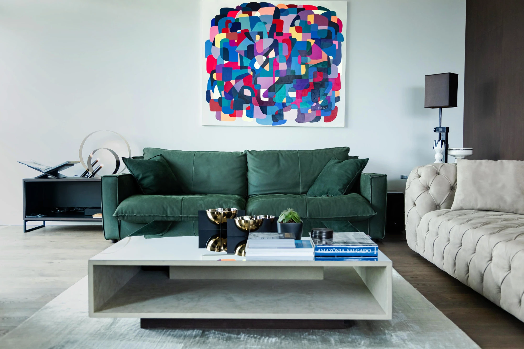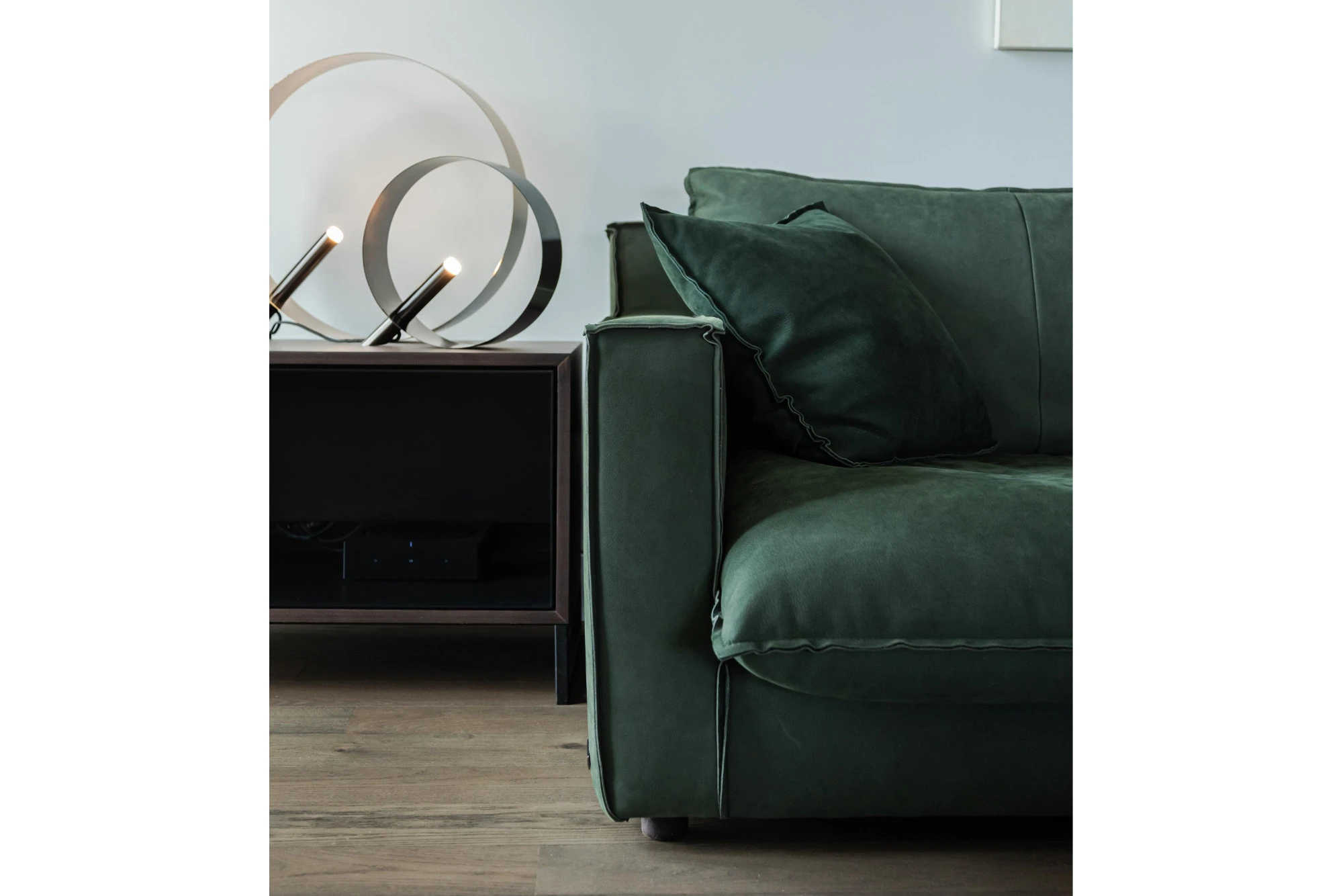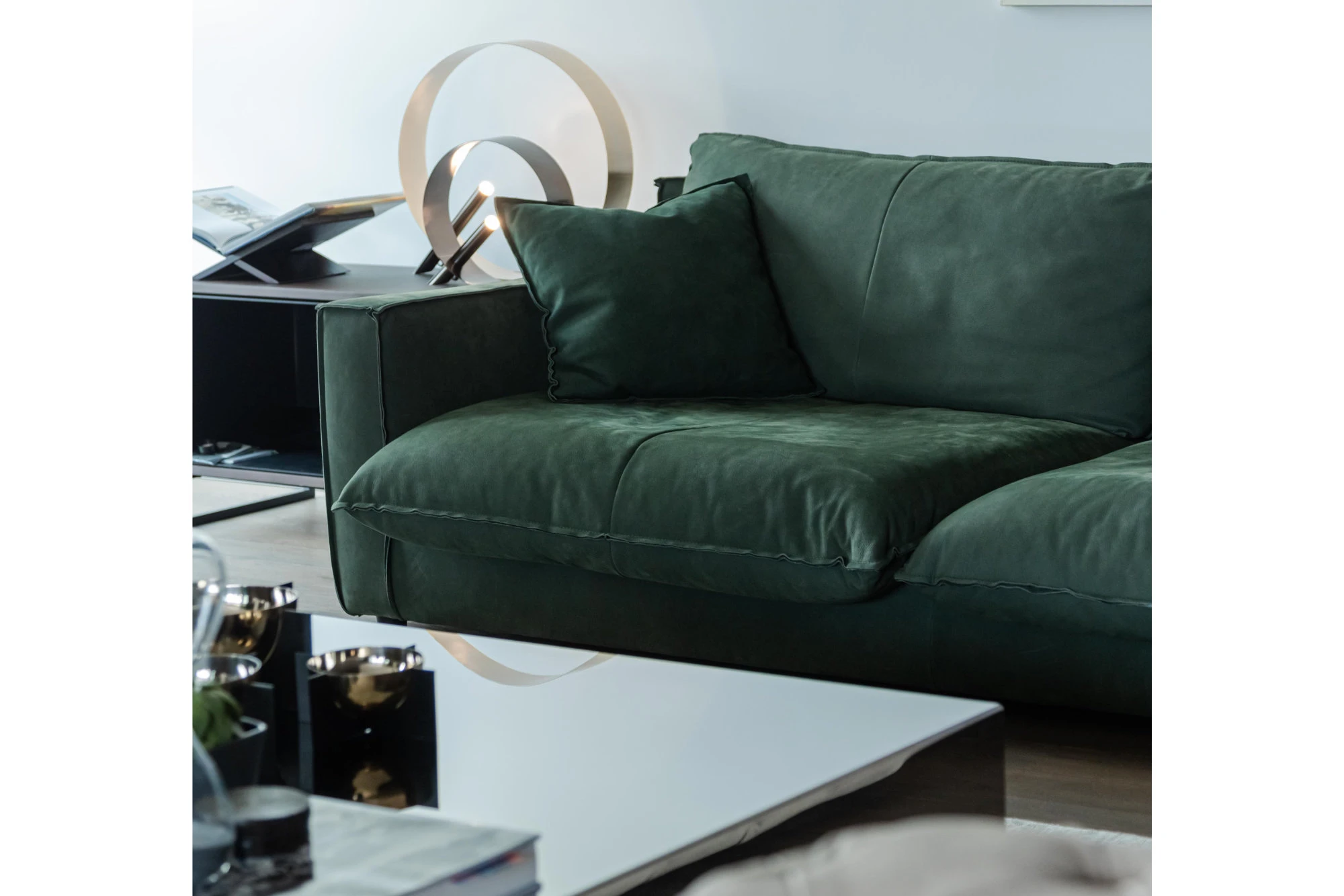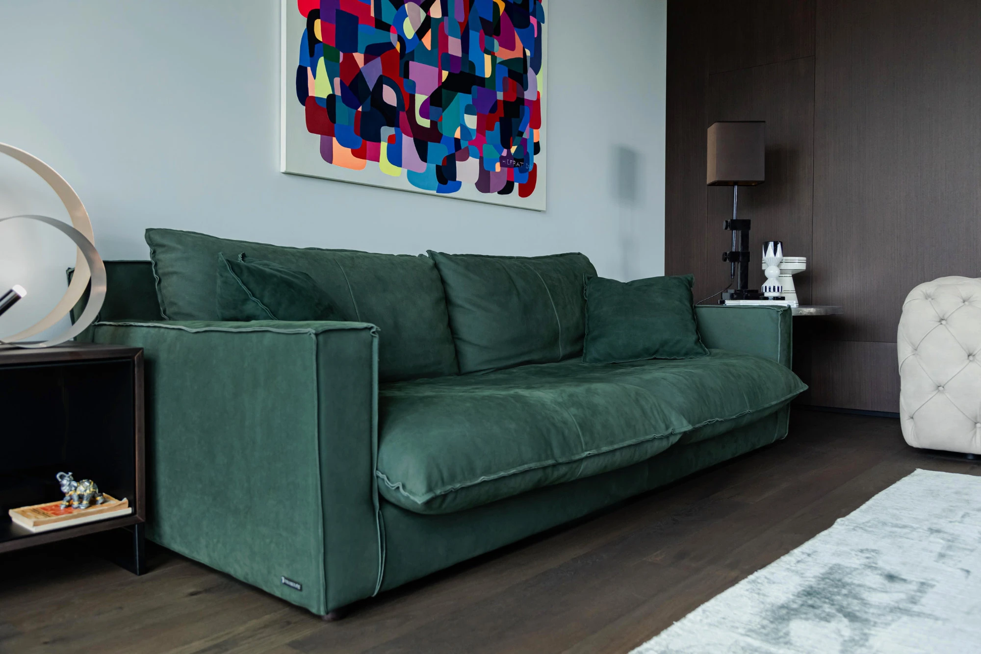 - Изключително комфортният диван Nesting на италианския производител Prianera в ментово-зелен естествен набук, с пълнеж от естествен пух и външни шевове.
