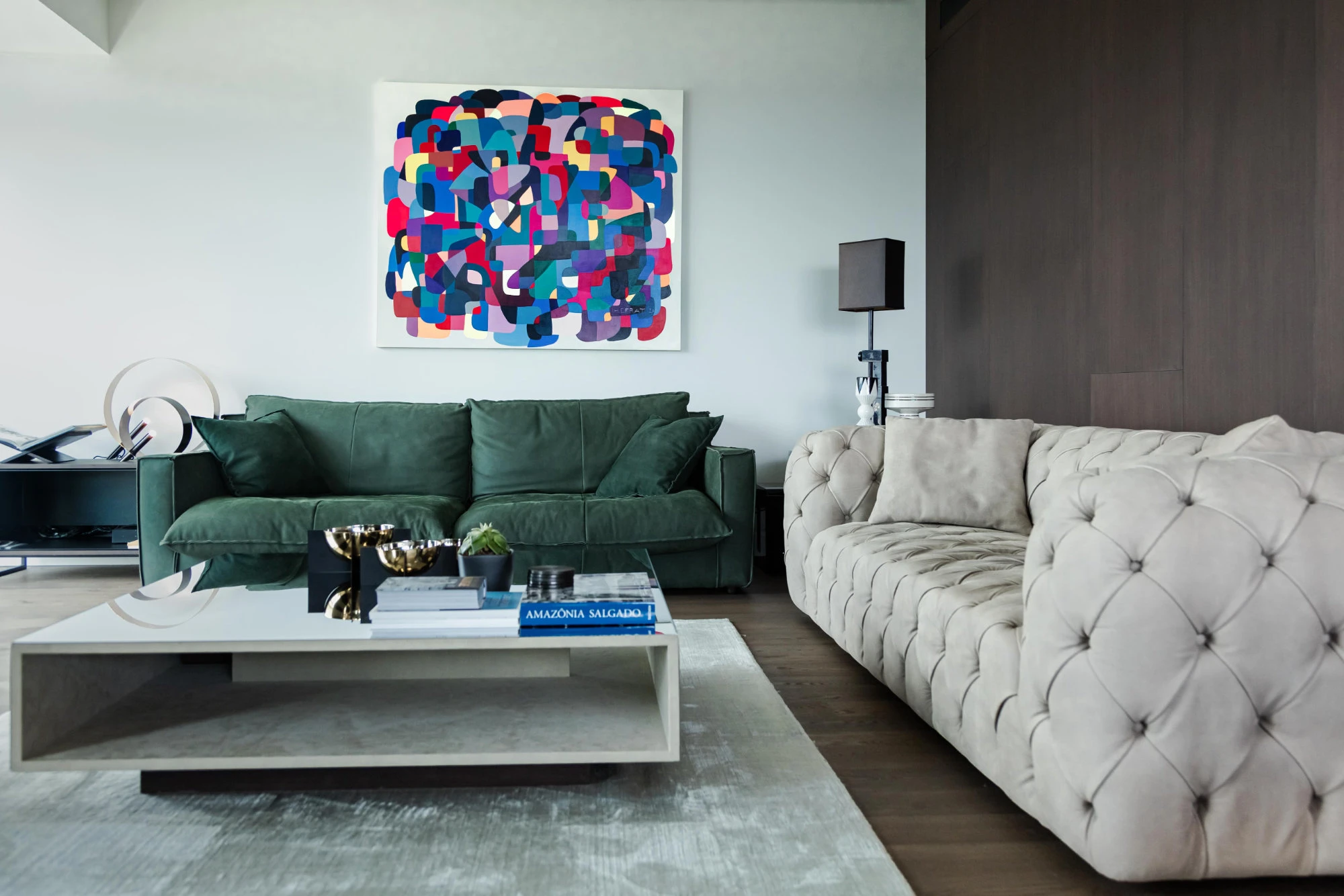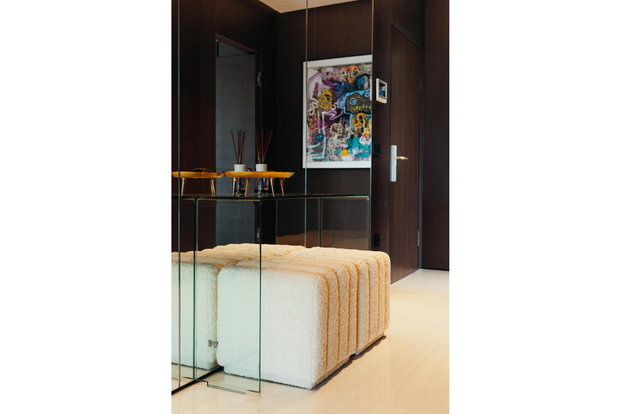 В този интериор използвахме единствено и само естествени материи и материали, като умело съчетахме дърво, метал, естествена кожа, вълна, коприна, бетон и истински седеф.