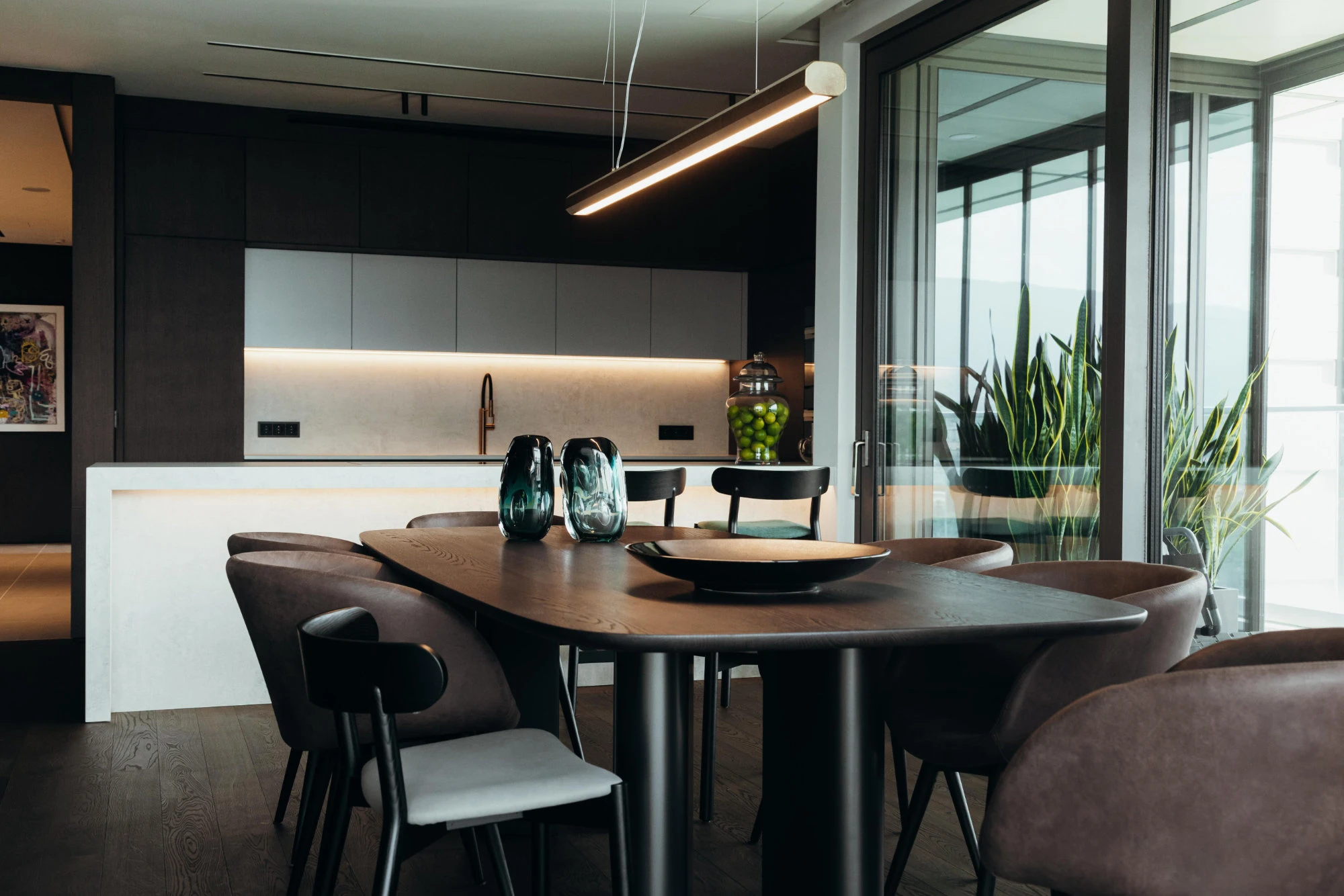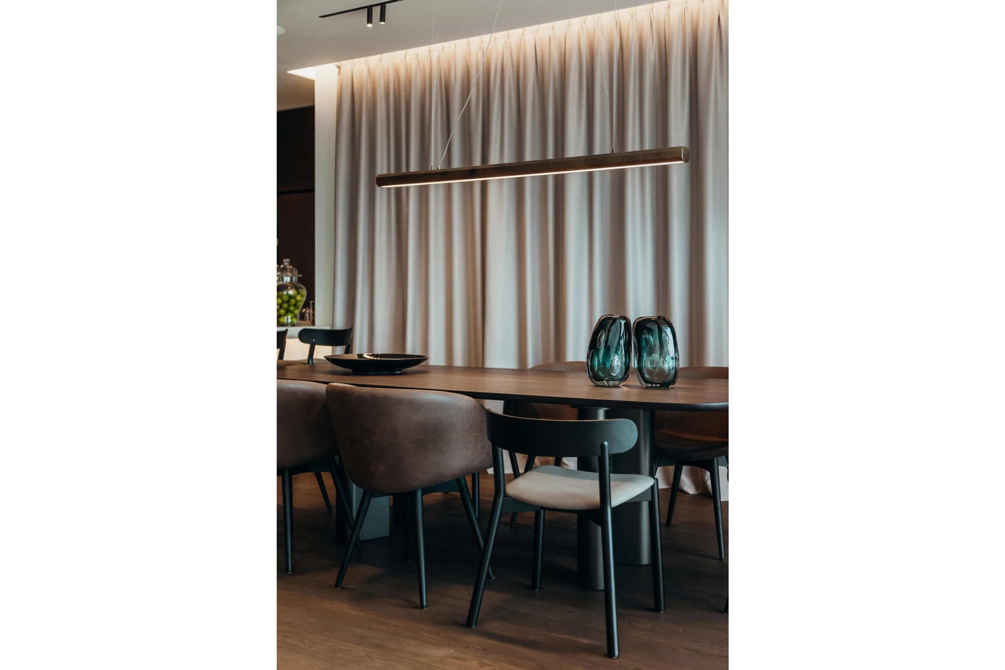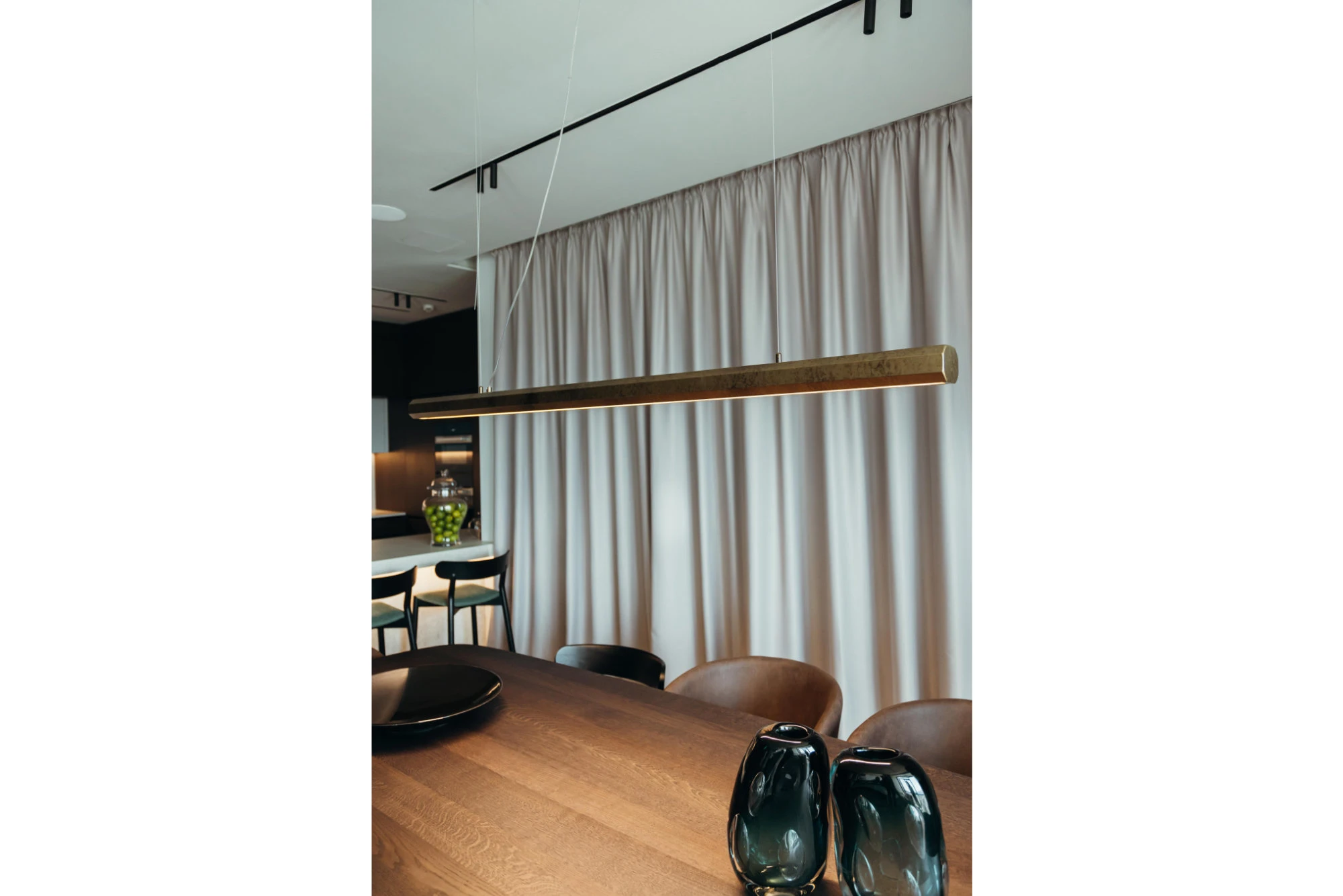 Трапезарният кът е озарен от линеарно осветително тяло от бетон в бронзов финиш, от колекцията на италианския бранд Marchetti, колекция Materica.