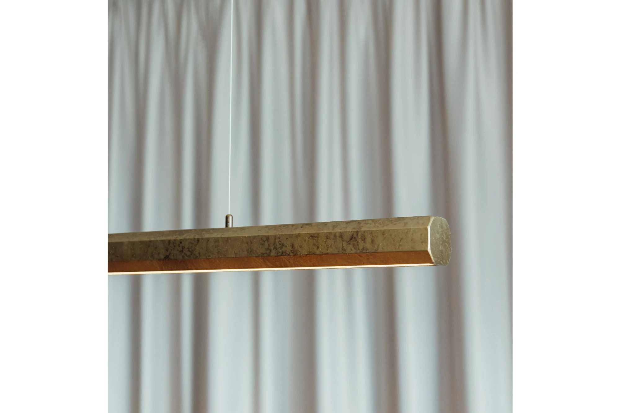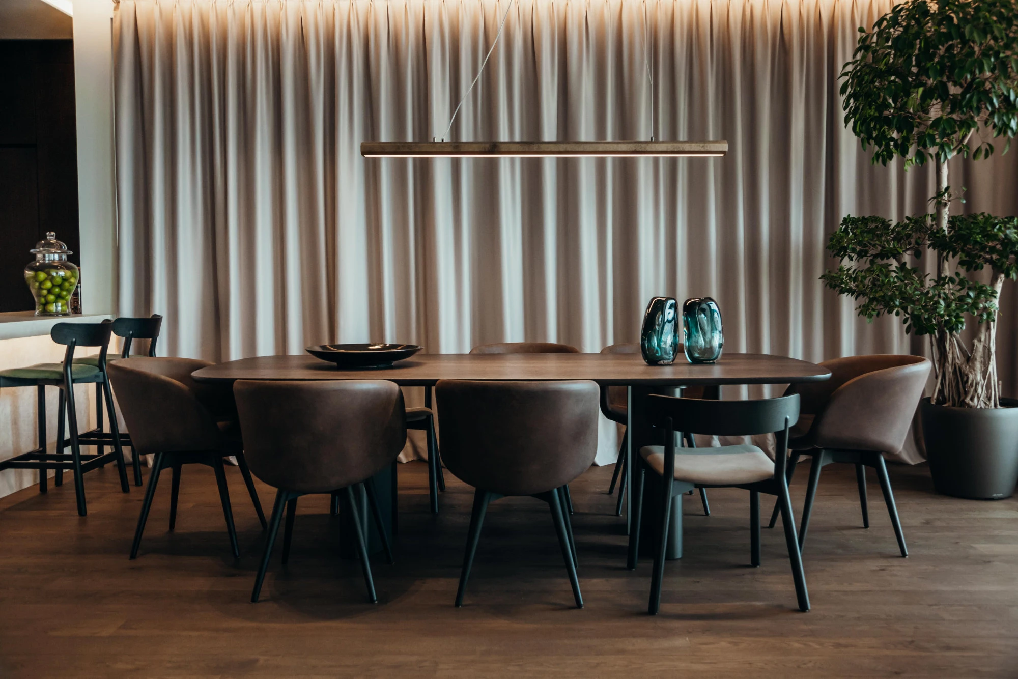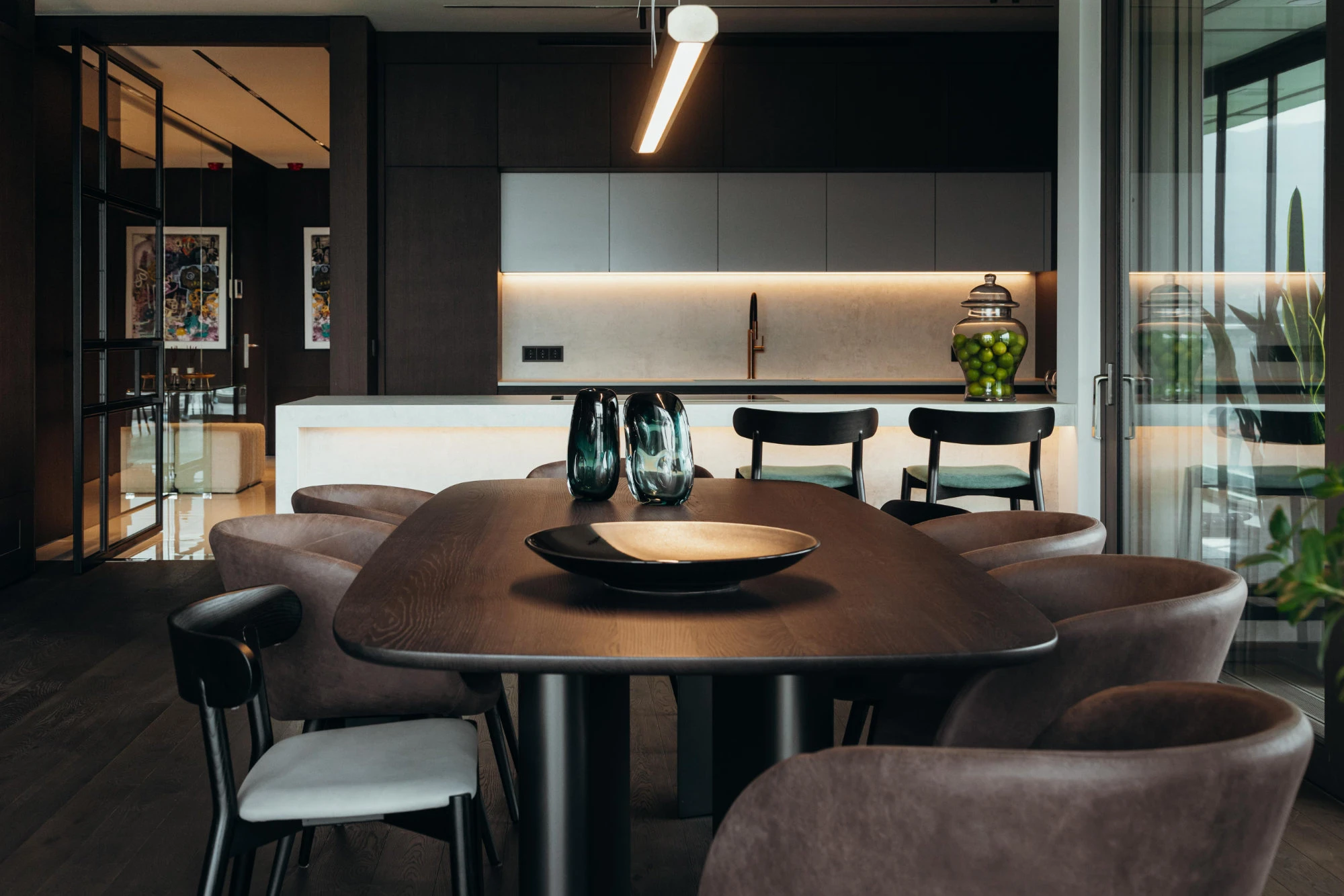 Трапезарният кът е озарен от линеарно осветително тяло от бетон в бронзов финиш, от колекцията на италианския бранд Marchetti, колекция Materica.