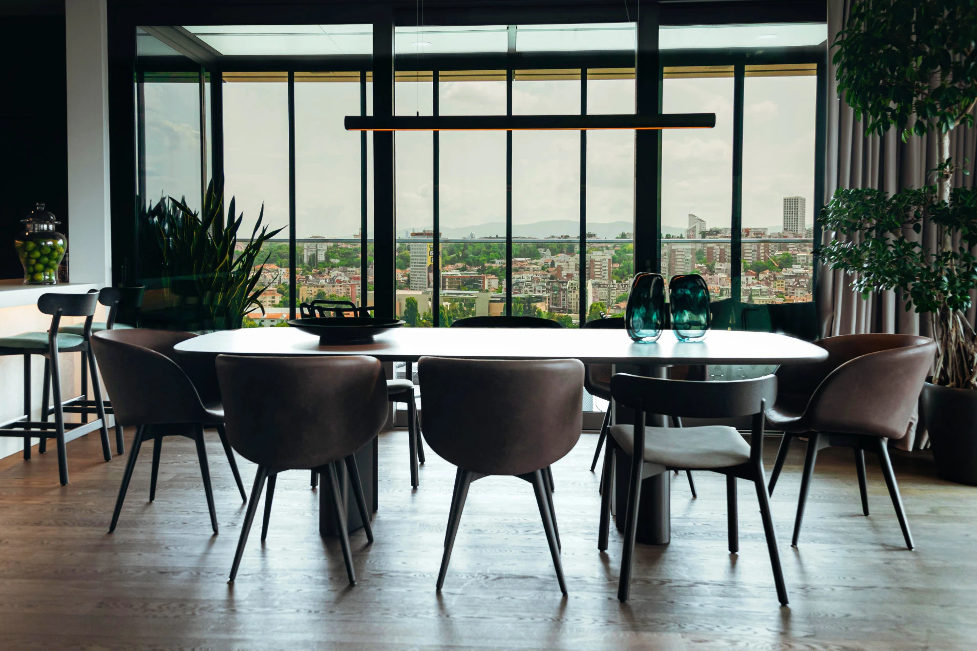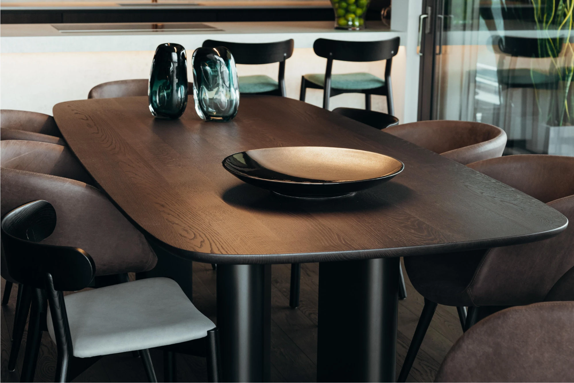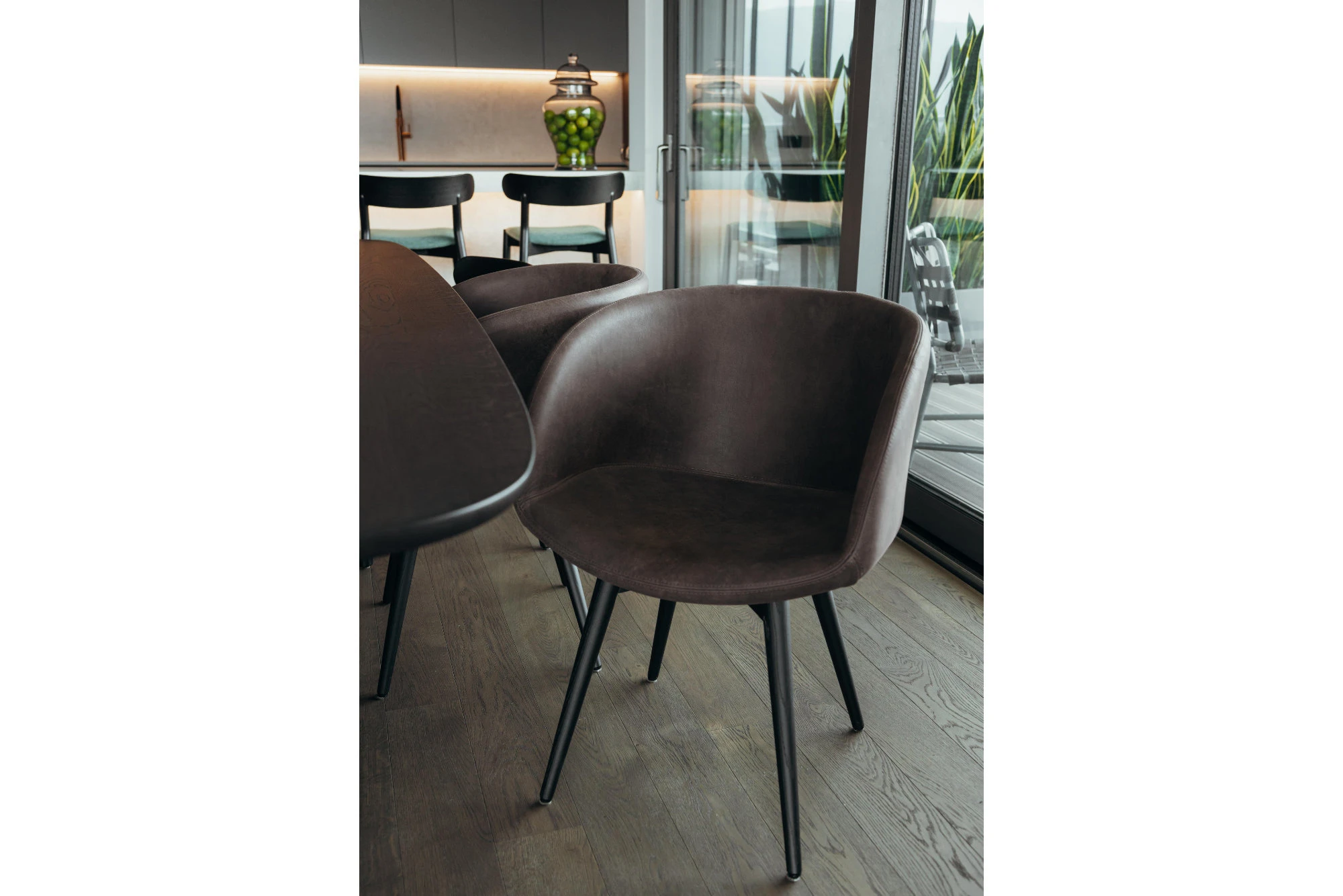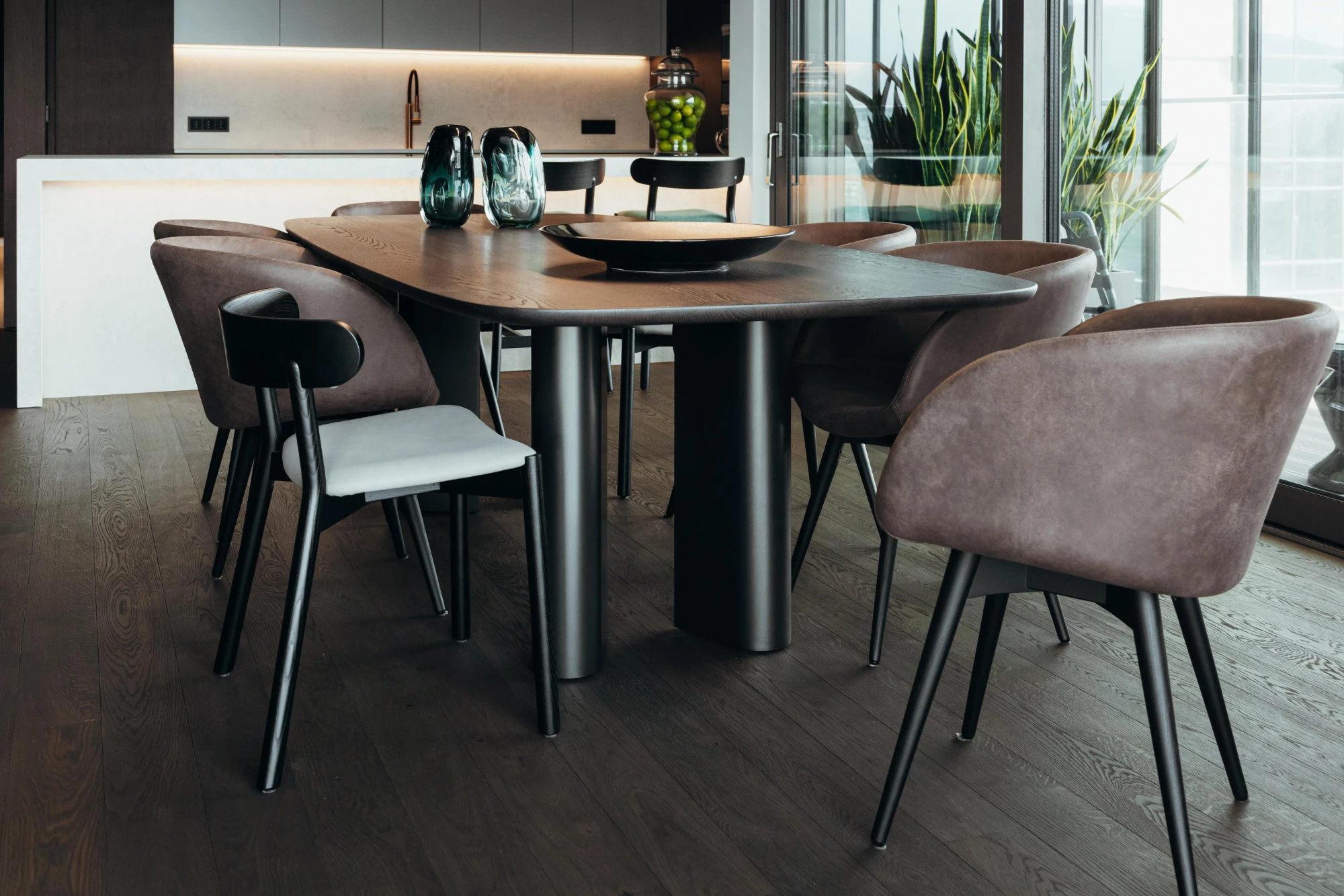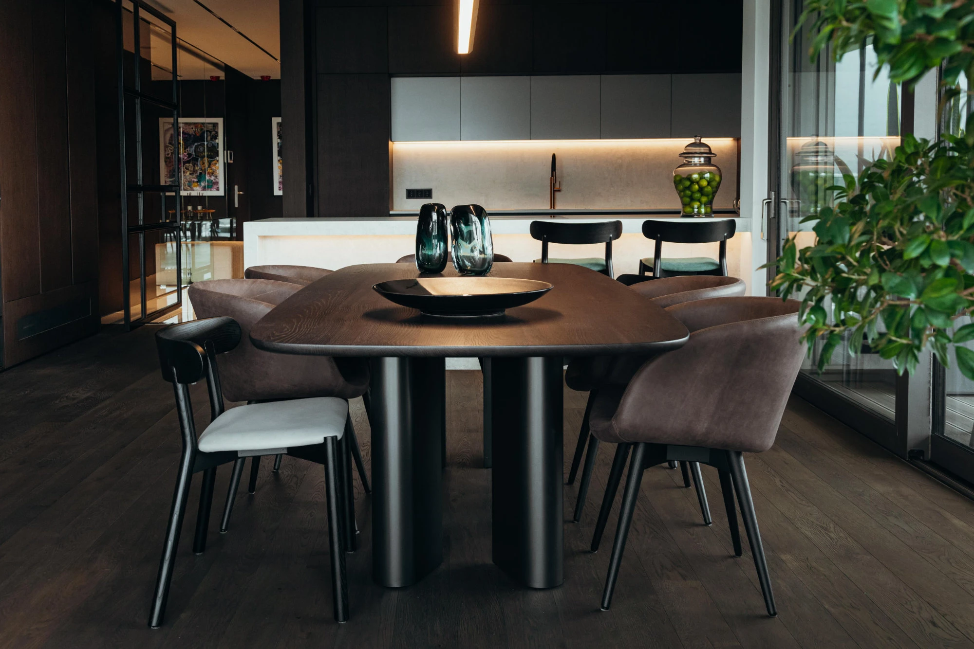 Трапезарните столове, които я заобикалят, избрахме от италианския производител Midj, модел Sonny, и са във винтидж естествена кожа в цвят на топъл шоколад – хармонично допълнение към топлия естествен дъб на трапезарната маса. Столовете са безапелационно удобни и уютно прегръщат гостите си.