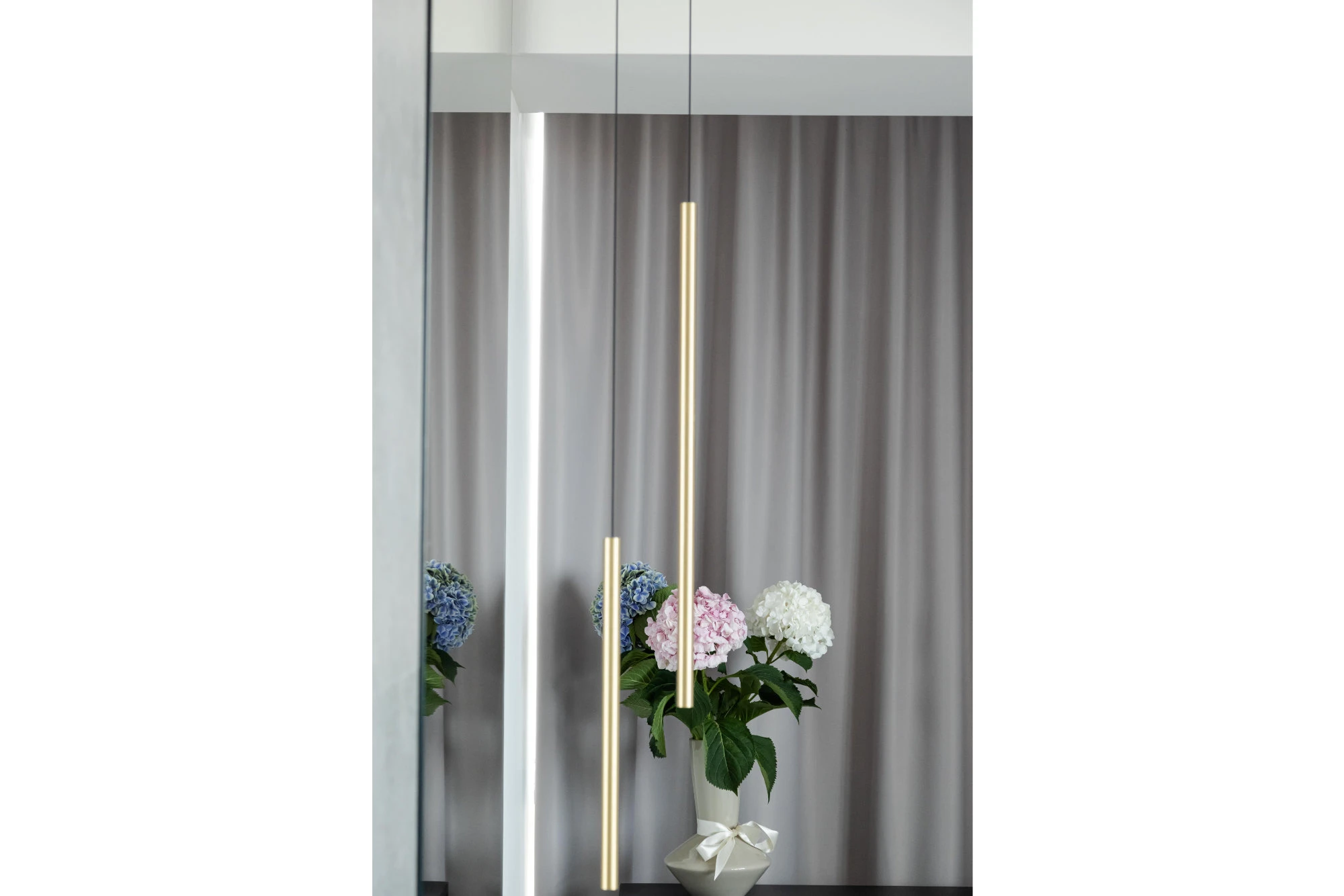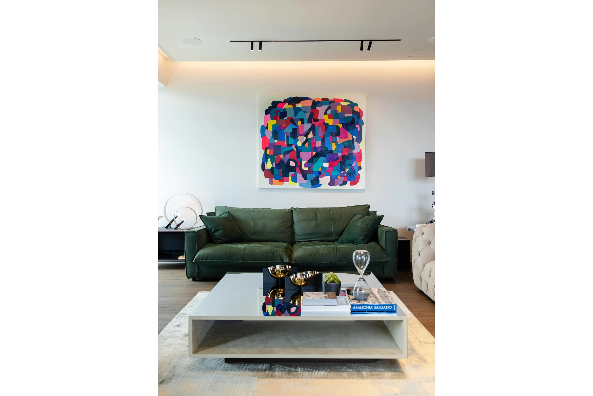 Целият кадър на дневната зона е дискретно осветен от странично осветление на италианските брандове Smania и Riflessi (LED LOOP T BIG и LED LOOP T SMALL). Материалите на осветителните тела са отново метал и истински черен седеф.