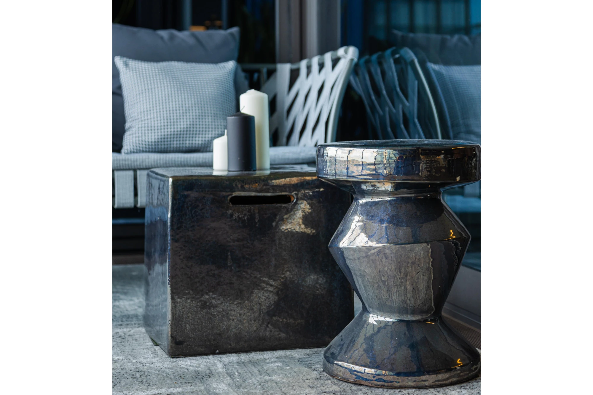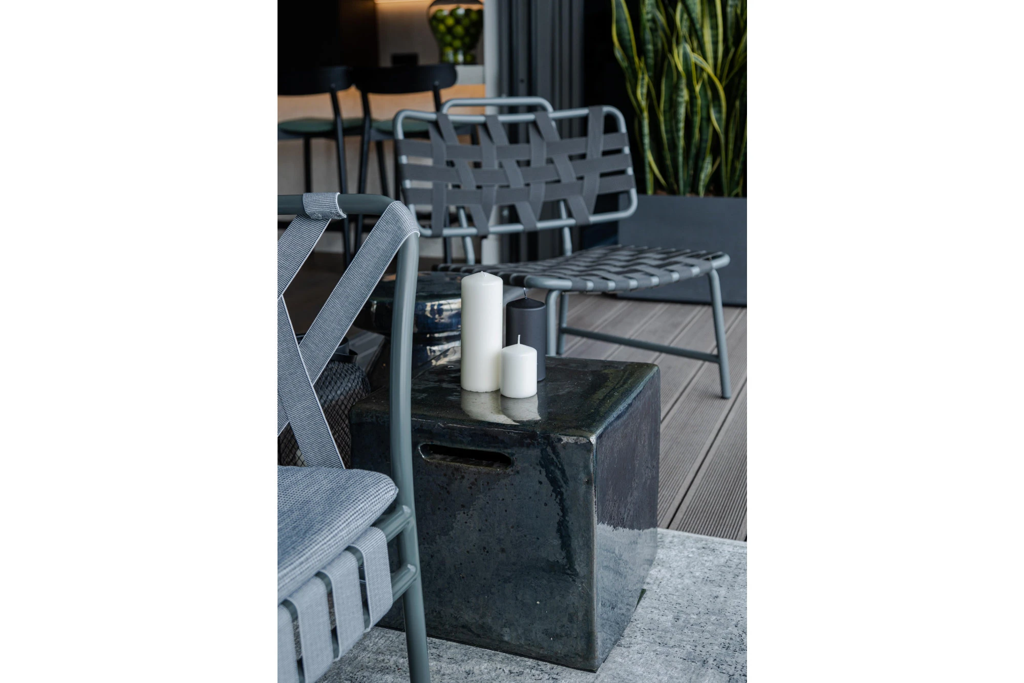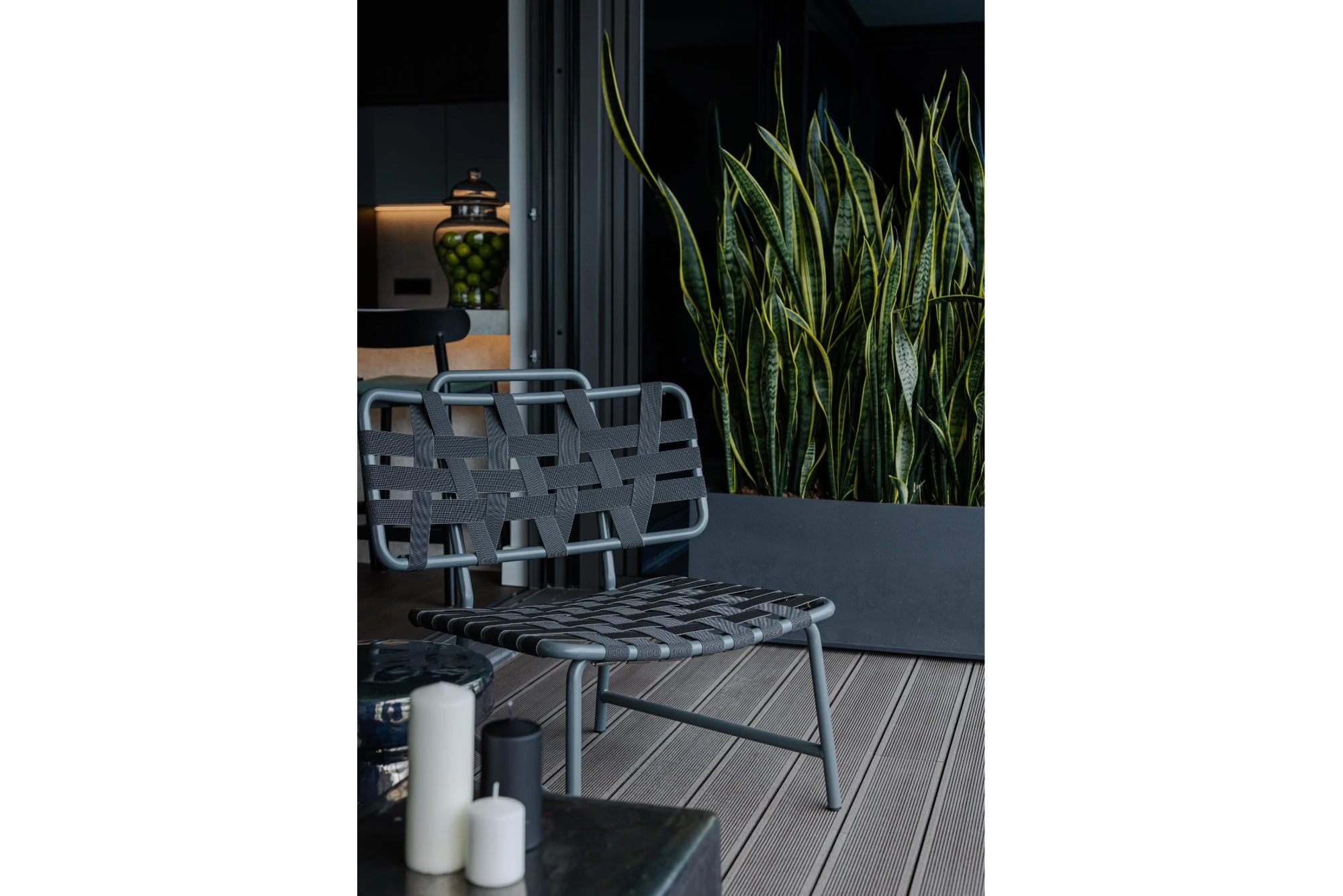 Диванът и фотьойлът, от колекция InOut на Gervasoni, са с изчистени форми, много напомнящи отново виенския Тонет (Thonet), но изпълнени в метал и преплетени широки ленти. Композицията е допълнена с масички от груба керамика във финиш на студен метал.
