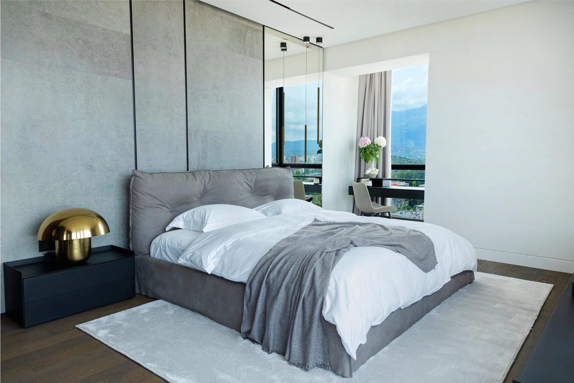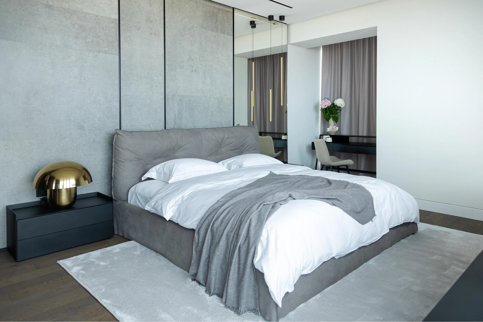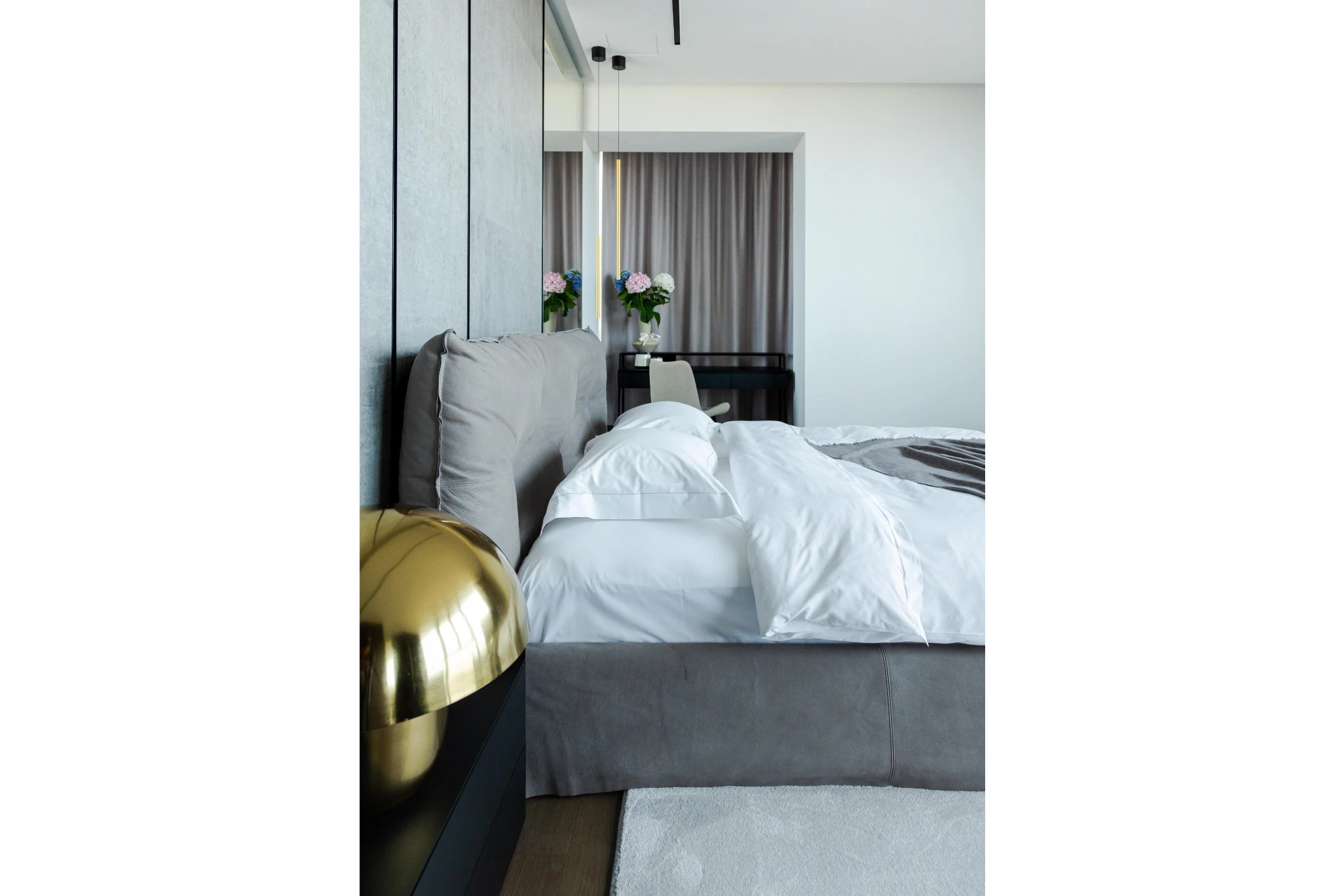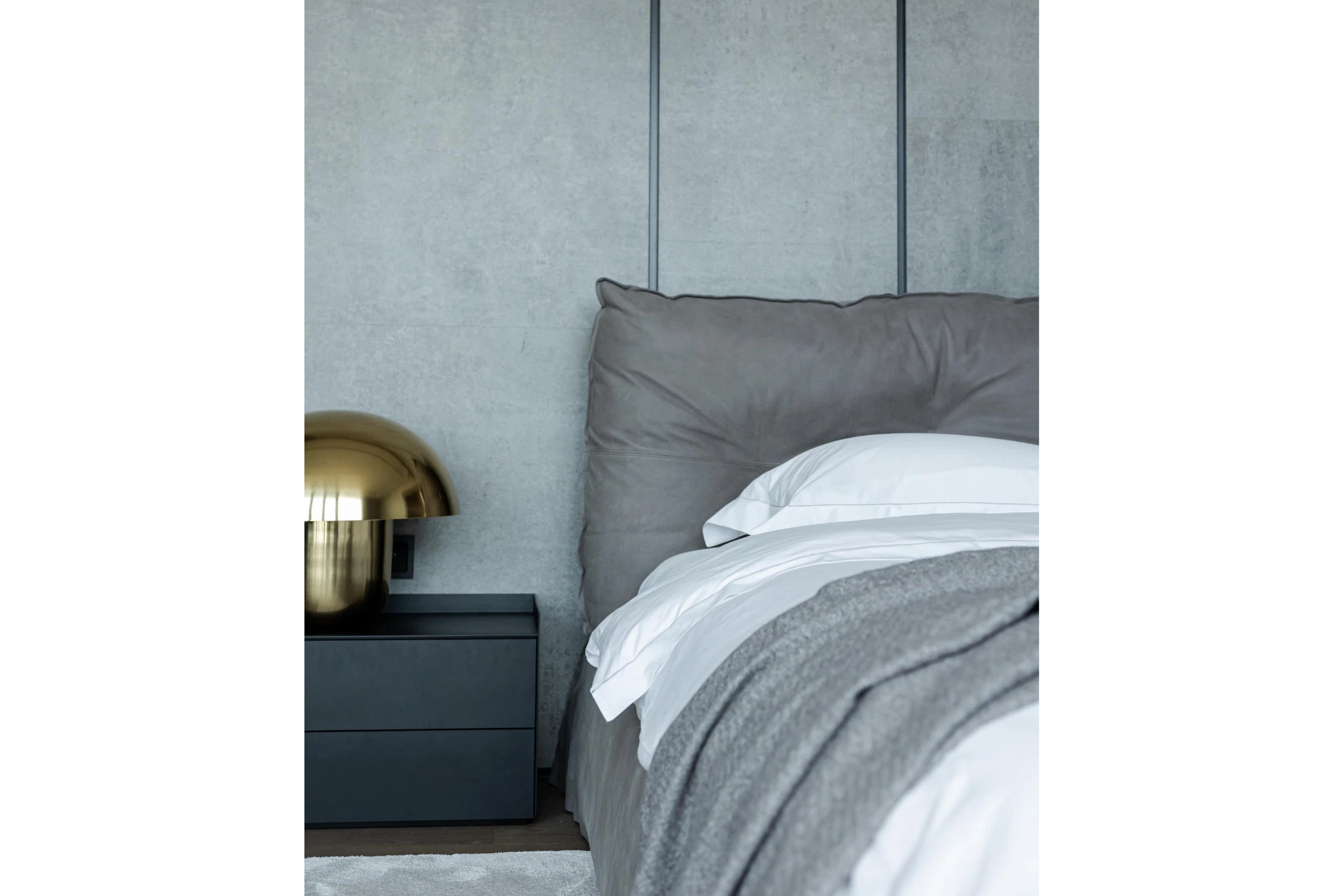 Леглото Aspen на италианския производител Flexteam е със специални размери, зададени от собствениците. Облечено е в естествен набук в топлата гама на сивото и е с богато присъствие на естествен пух в таблата. Меко, уютно и красиво място за истински релакс, провокативно разположено пред стена в бетонова мазилка, върху топъл дъбов под, застлан с копринен килим и с уникална гледка към града. От едната страна са спуснати две осветителни тела в цилиндрична форма, в златен финиш – модел Bull от италианския производител Zava Luce.