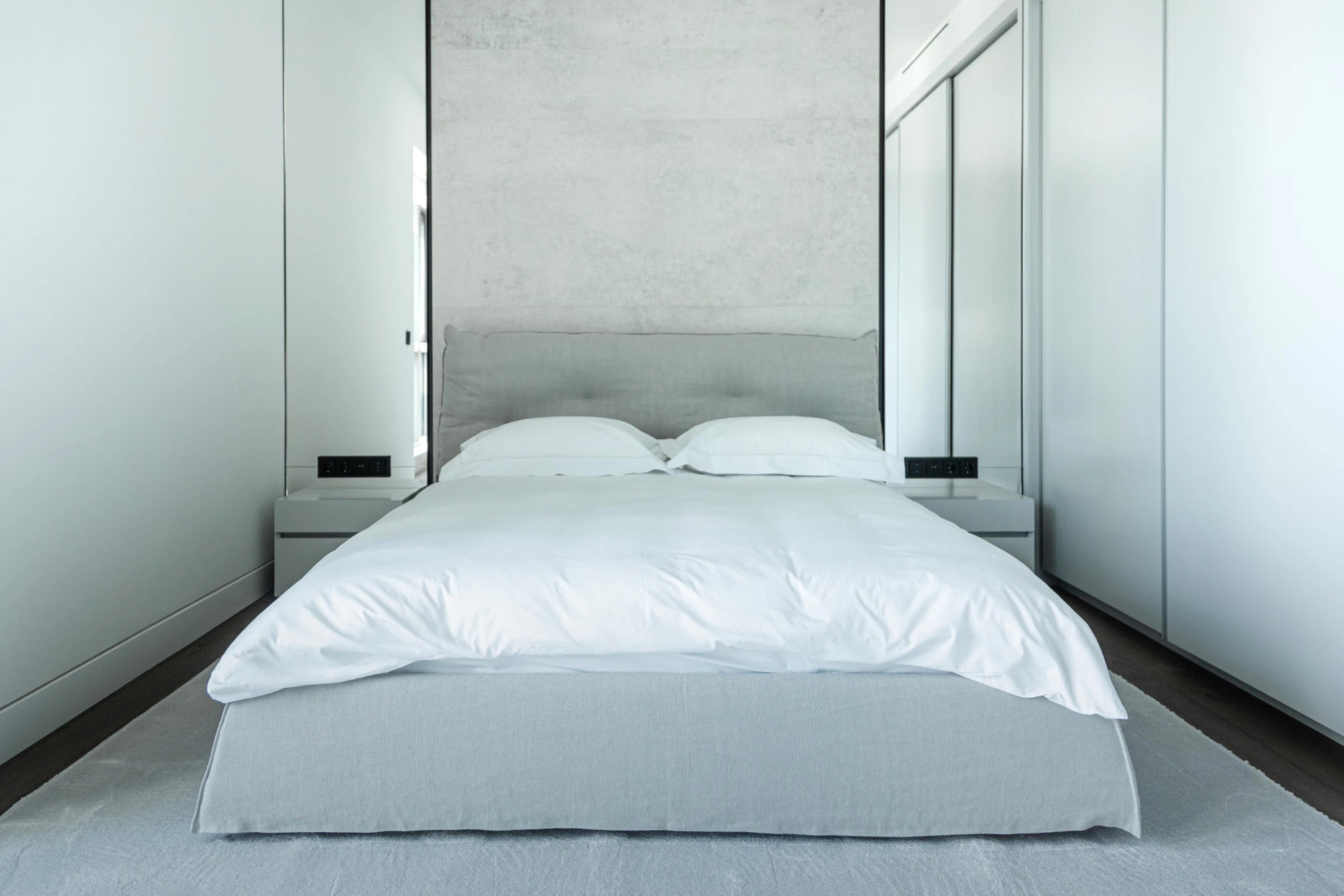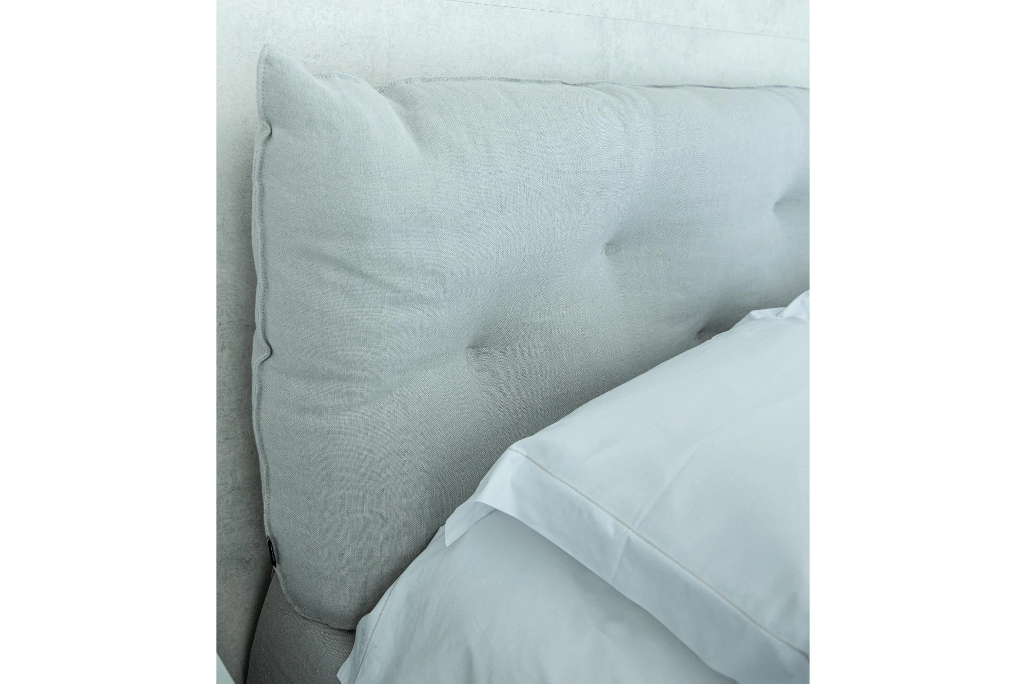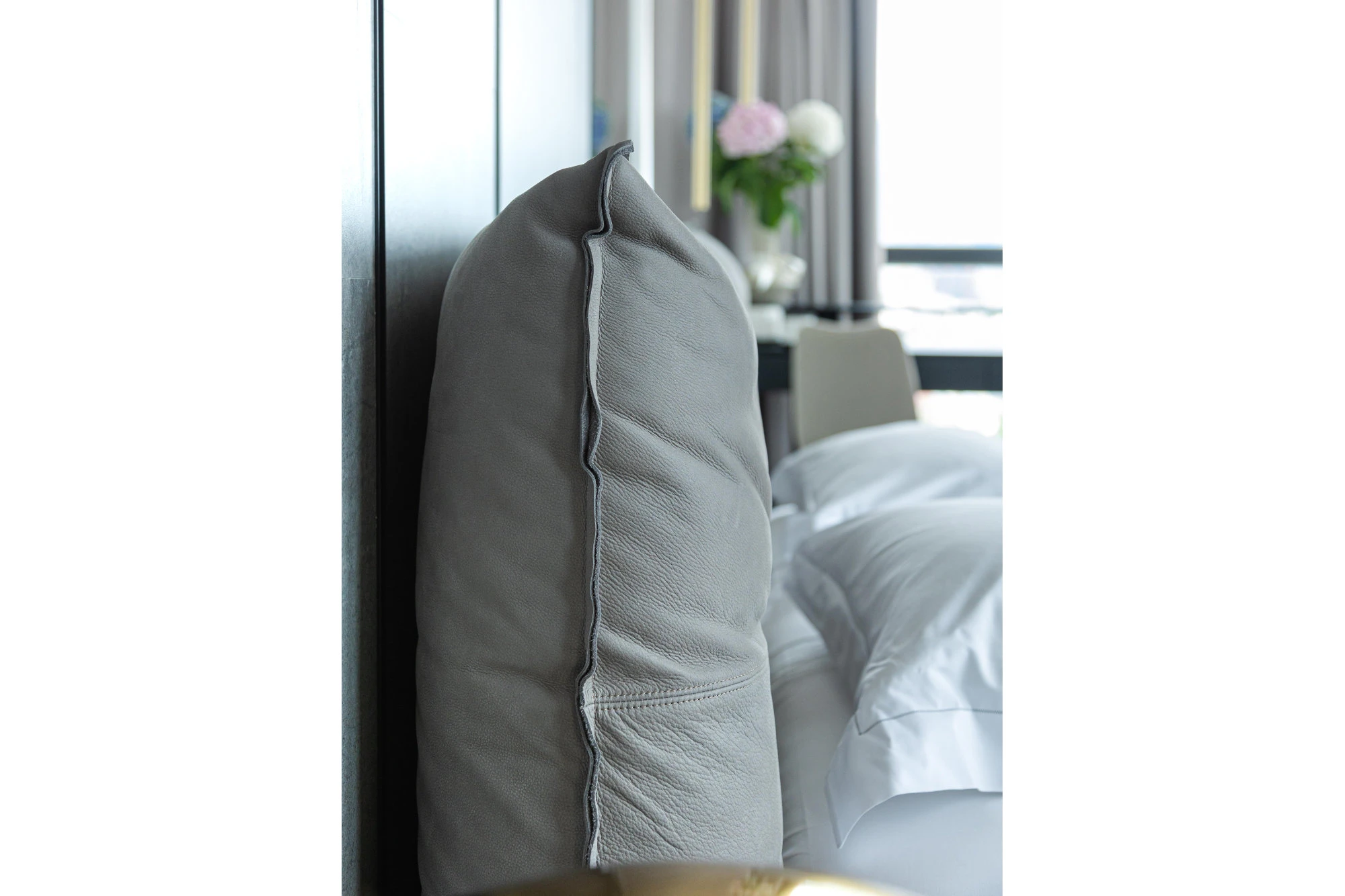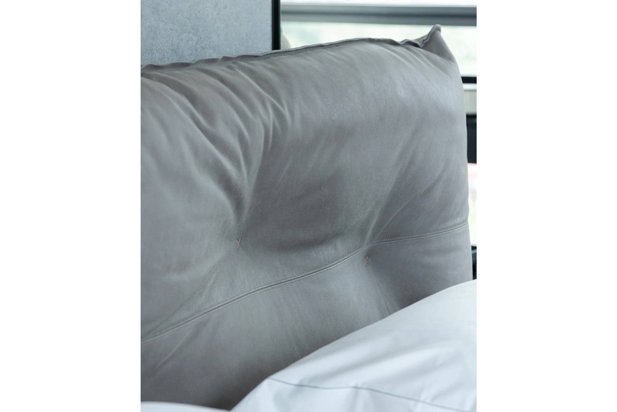 Леглото Aspen на италианския производител Flexteam е със специални размери, зададени от собствениците. Облечено е в естествен набук в топлата гама на сивото и е с богато присъствие на естествен пух в таблата. Меко, уютно и красиво място за истински релакс, провокативно разположено пред стена в бетонова мазилка, върху топъл дъбов под, застлан с копринен килим и с уникална гледка към града. От едната страна са спуснати две осветителни тела в цилиндрична форма, в златен финиш – модел Bull от италианския производител Zava Luce.