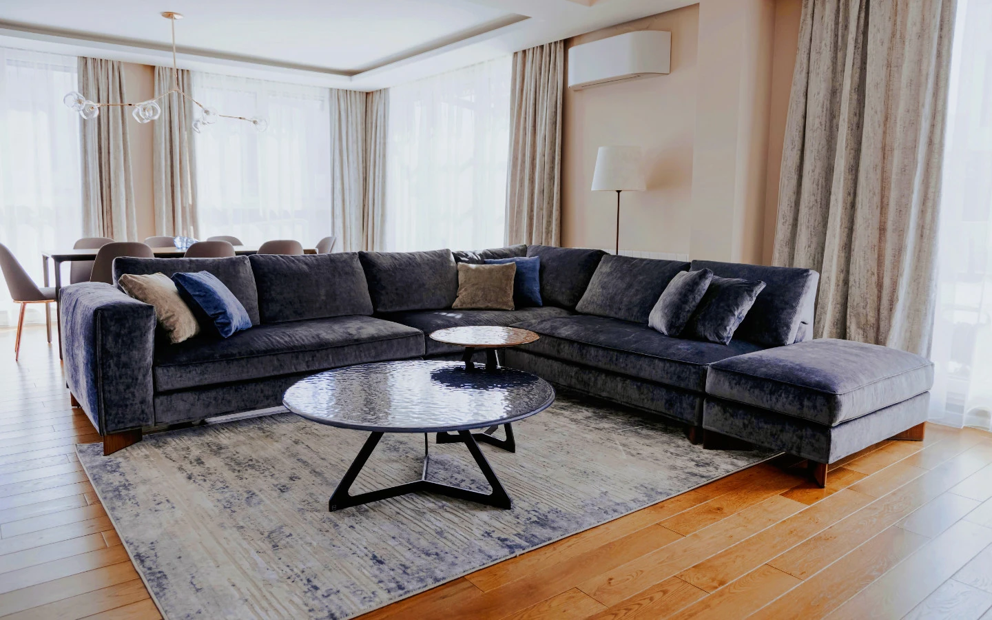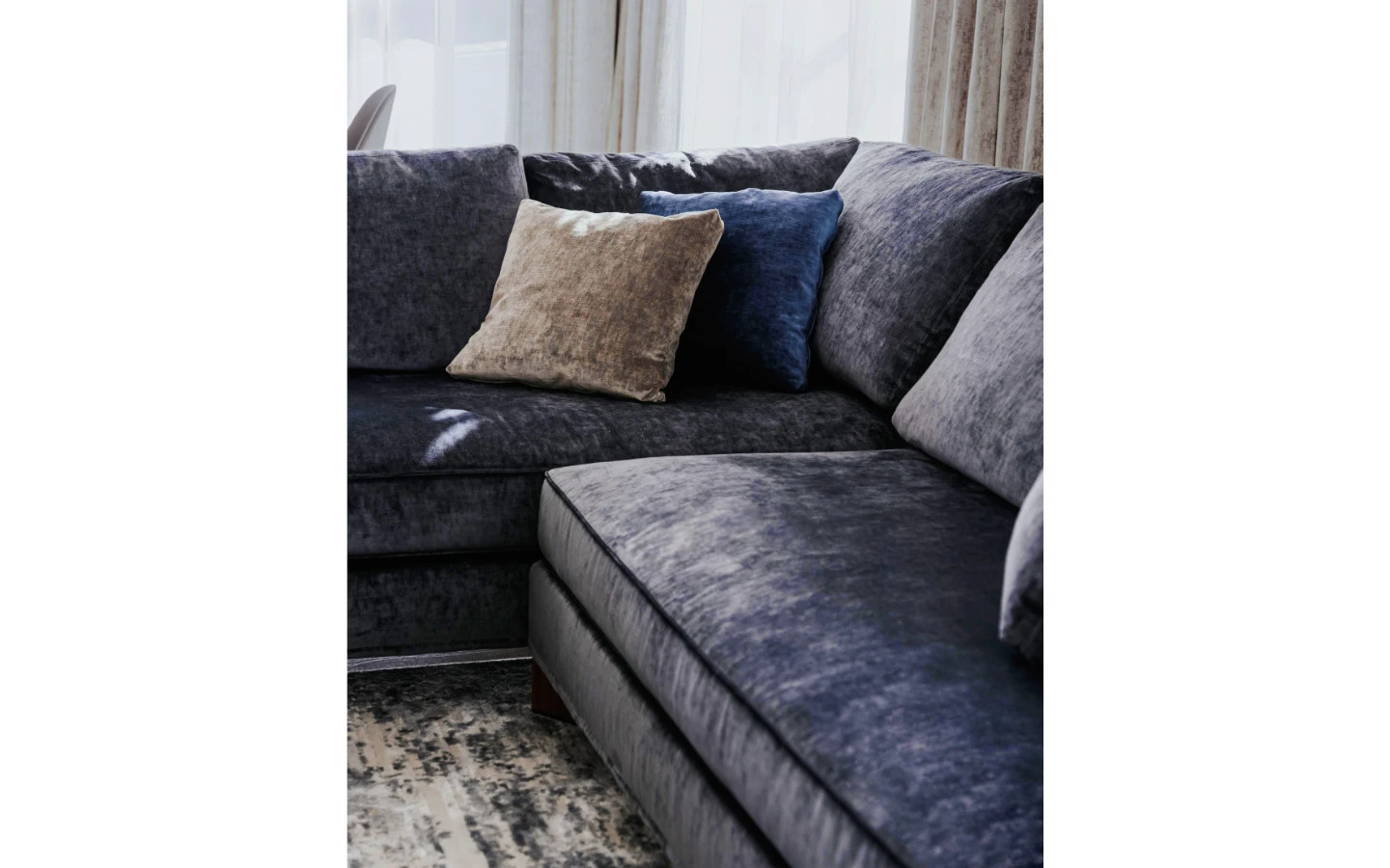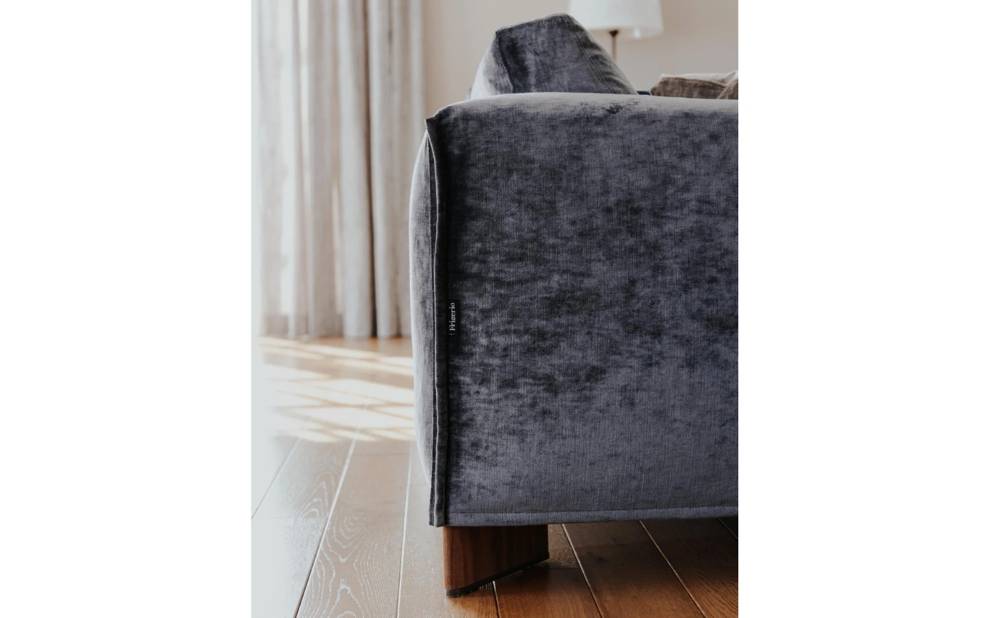 В зоната за релакс разположихме голям ъглов диван от колекцията Davis на италианския производител на мека мебел Frigerio. Диван с непреходен дизайн и уникален комфорт. За дамаската на дивана избрахме висококачествен плюш в сиви тонове с меки и дълбоки нюанси, който елегантно контрастира и подчертава топлите отблясъци на кухнята и детайлите в меден цвят.
