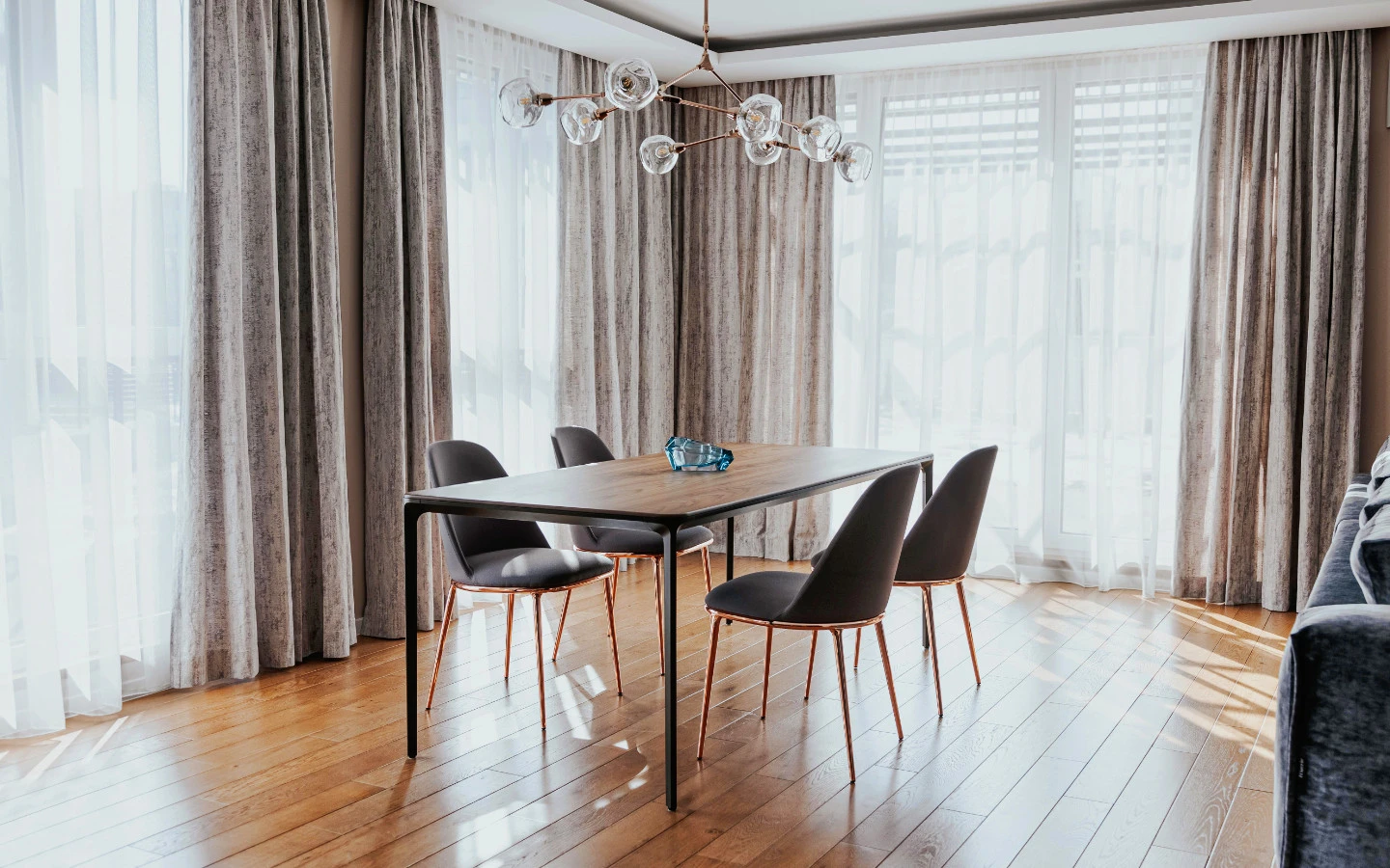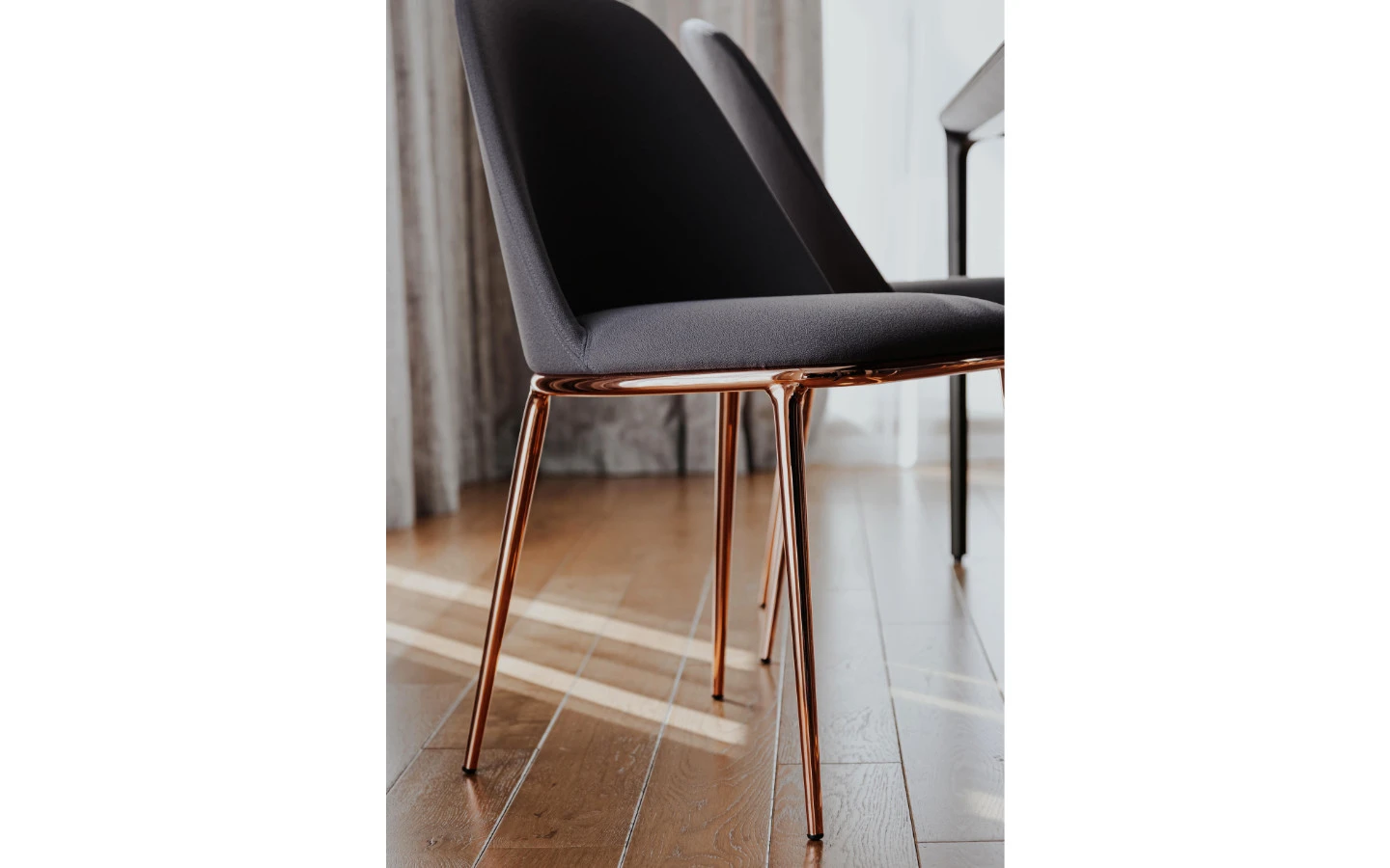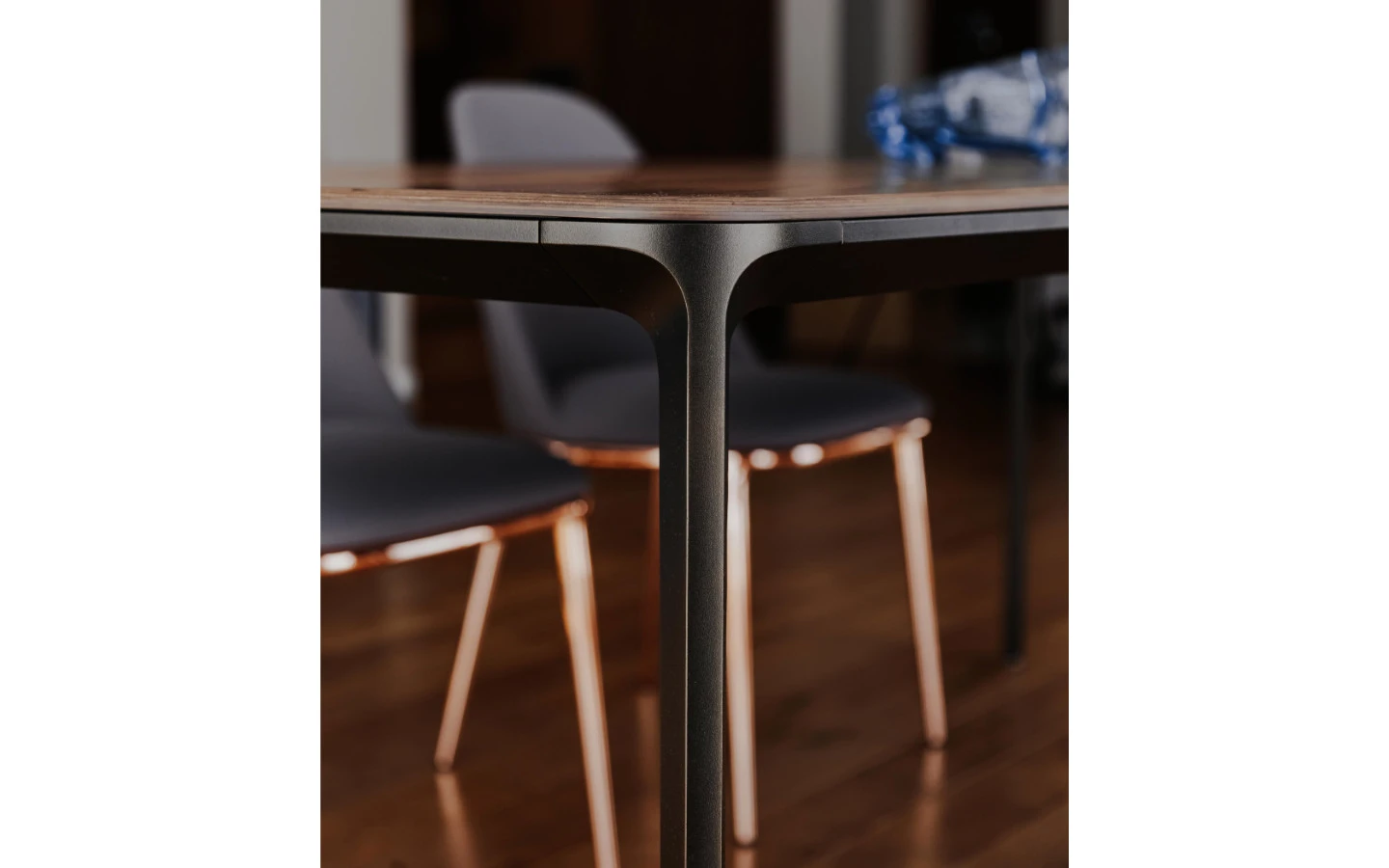 За трапезарната зона избрахме масата Slim от италианския производител SOVET. Маса с меки заоблени форми и изящен детайл на основата и плот от орех Canaletto, която съчетахме с трапезарни столове Lea от MIDJ Italia. Фините крачета на трапезарните столове нежно проблясват в меден оттенък, а тапицерията им елегантно контрастира с пастелно сива дамаска.
