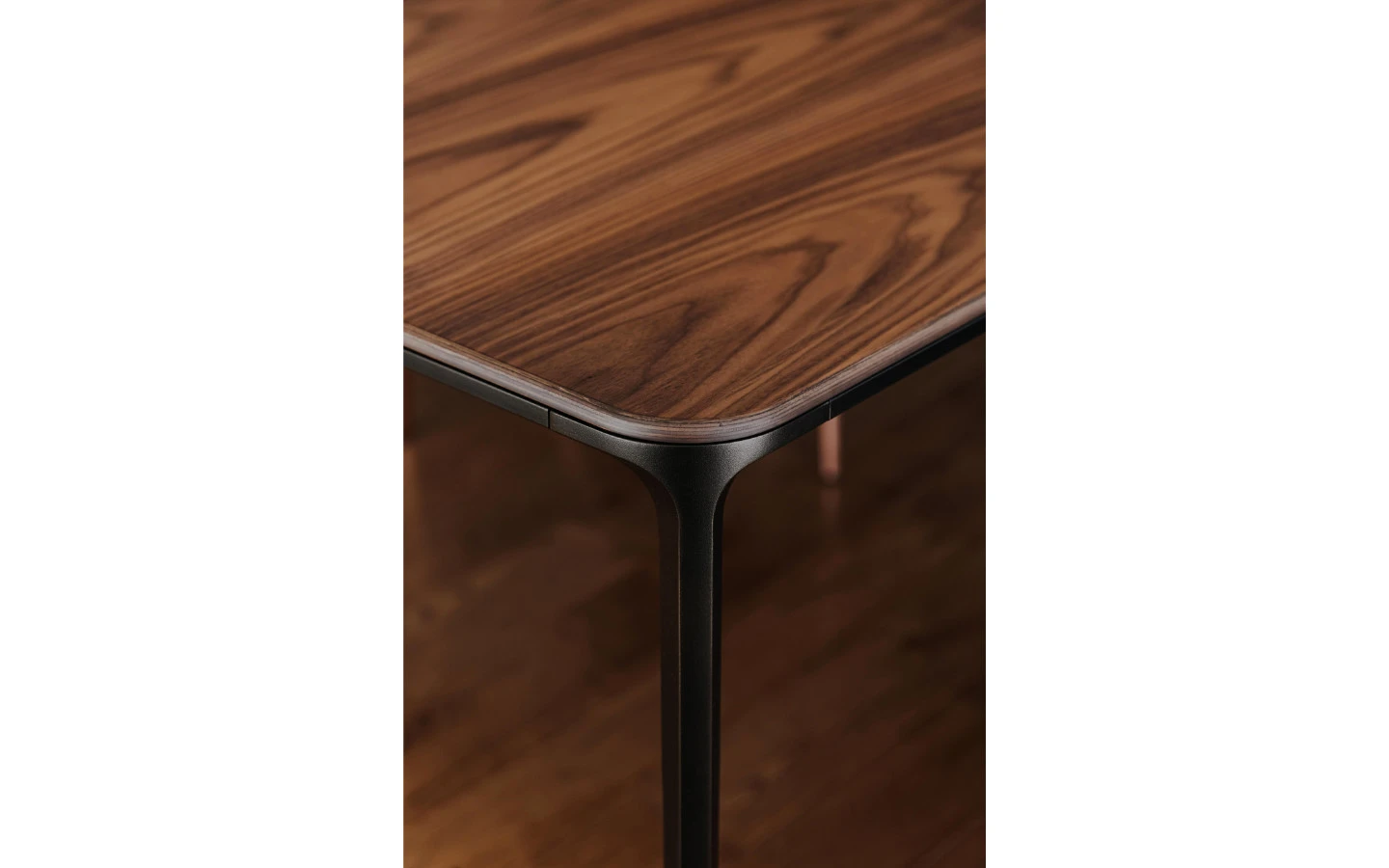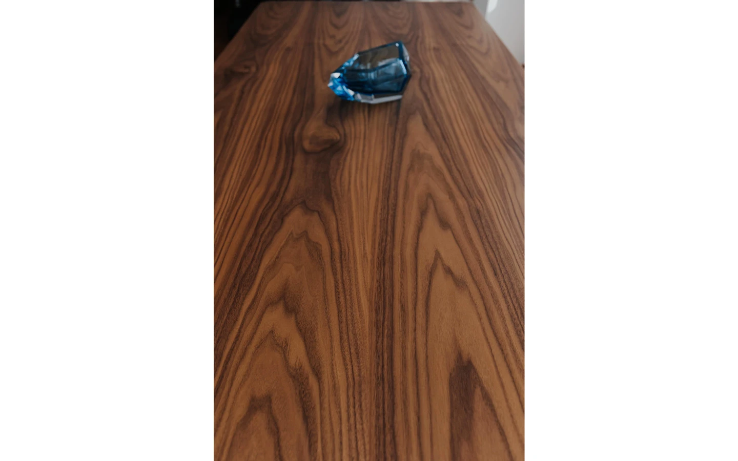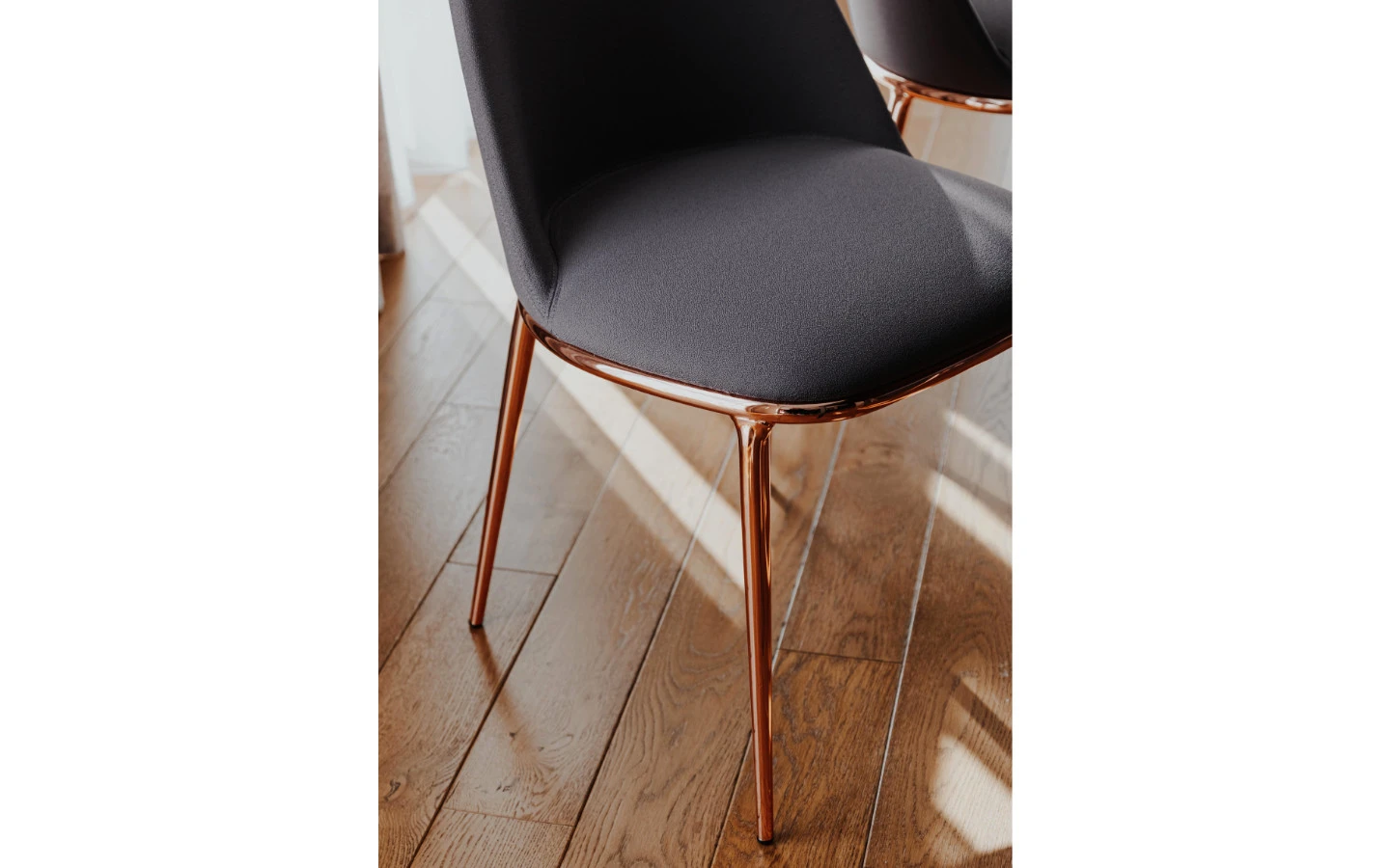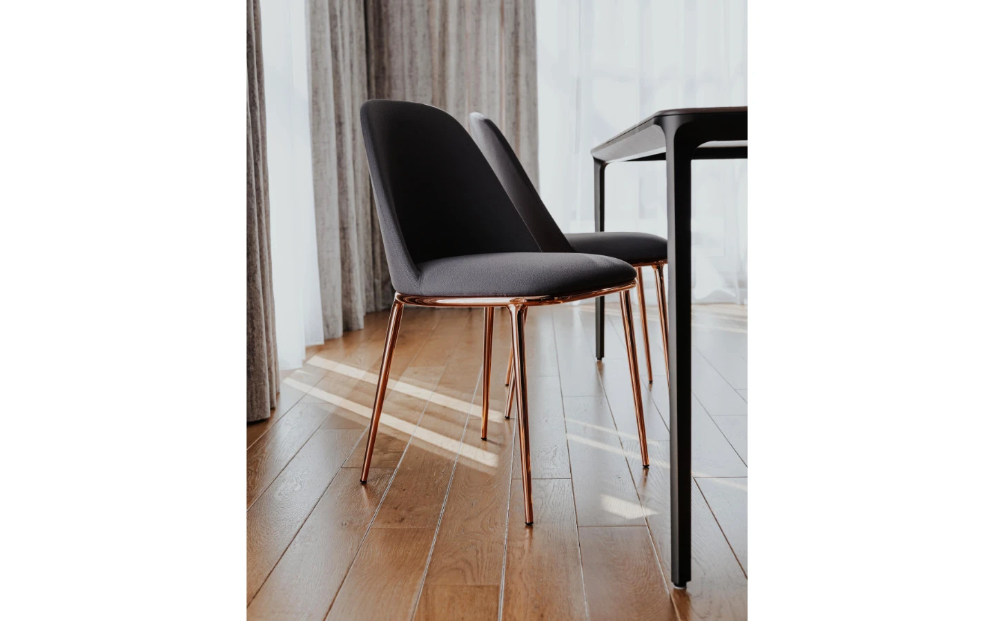 За трапезарната зона избрахме масата Slim от италианския производител SOVET. Маса с меки заоблени форми и изящен детайл на основата и плот от орех Canaletto, която съчетахме с трапезарни столове Lea от MIDJ Italia. Фините крачета на трапезарните столове нежно проблясват в меден оттенък, а тапицерията им елегантно контрастира с пастелно сива дамаска.