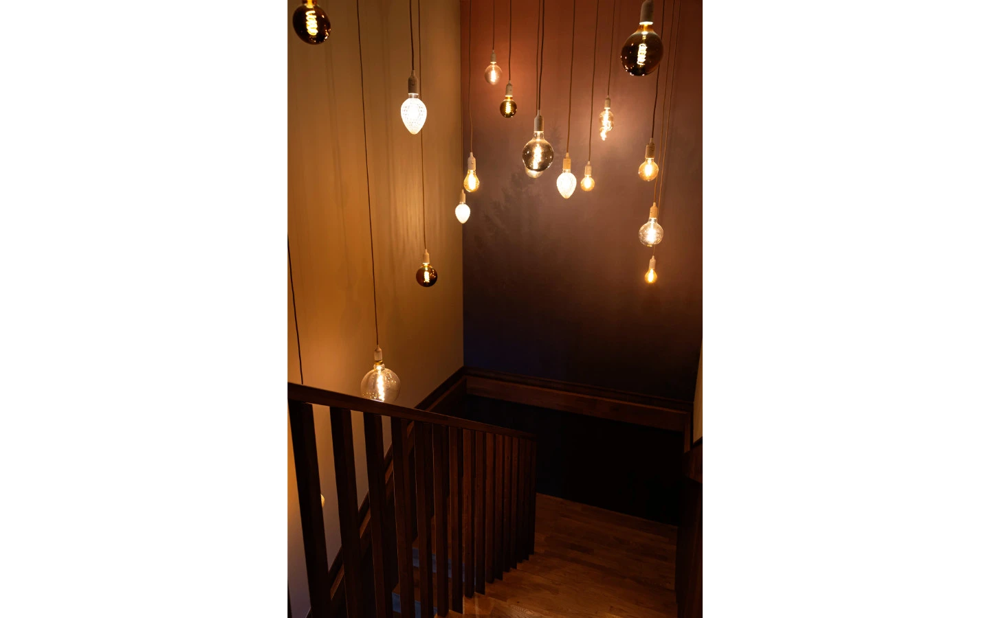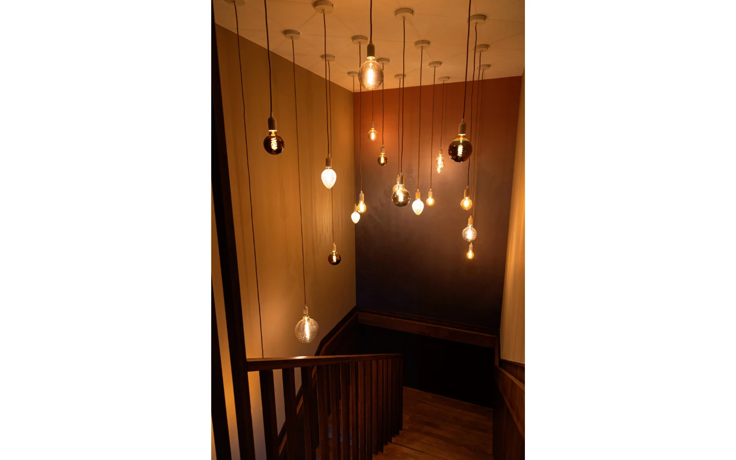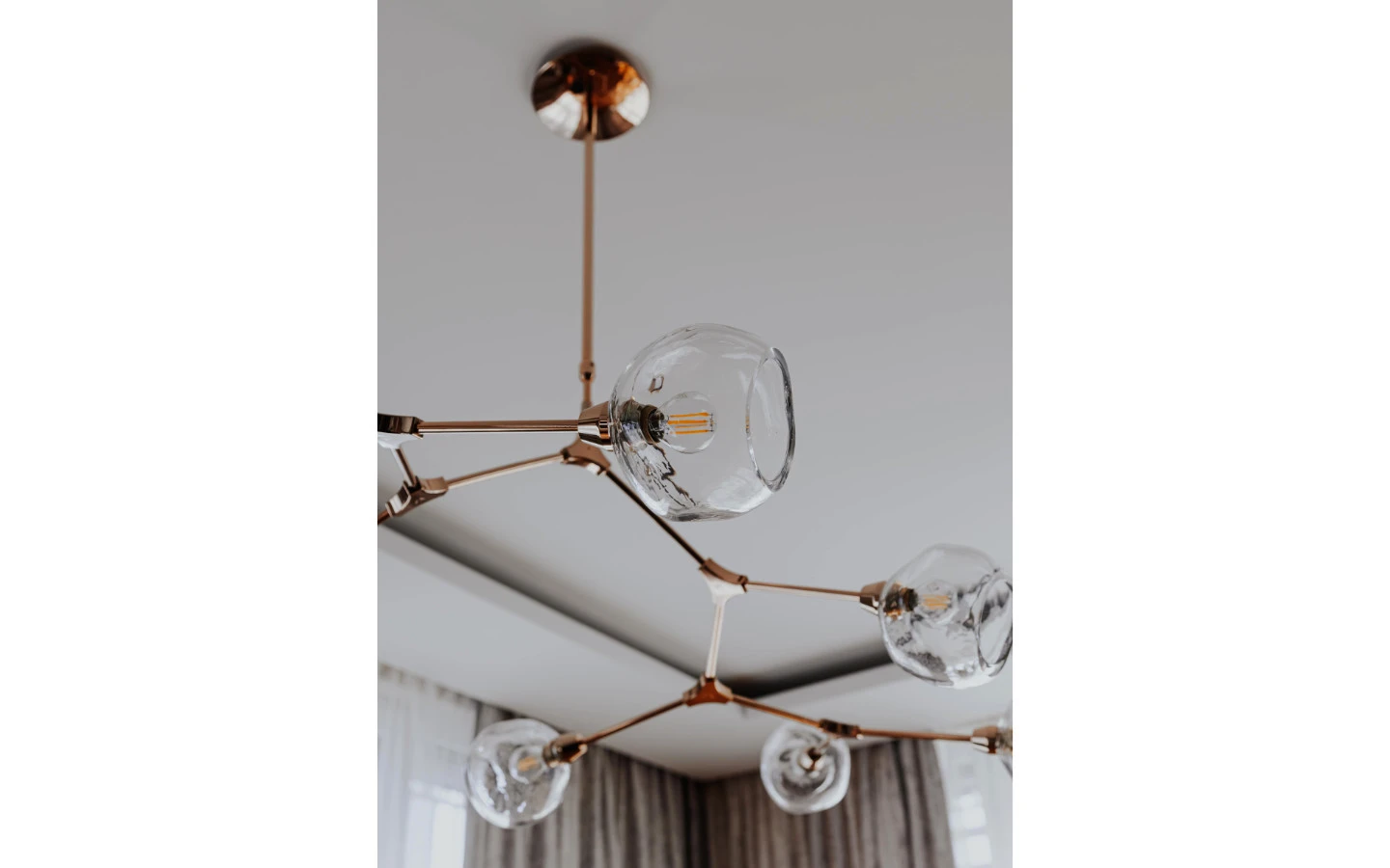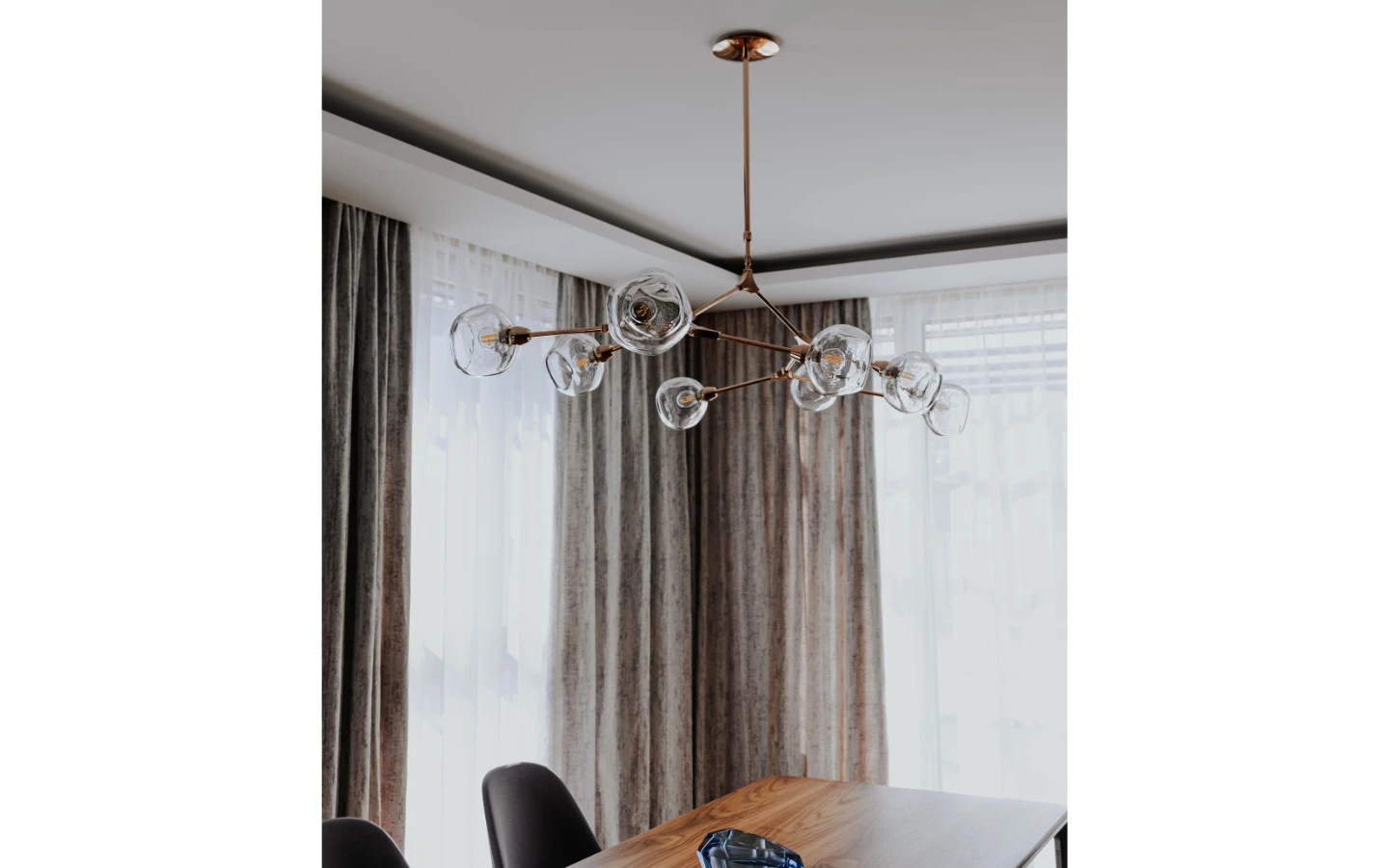 Осветително тяло Attanasio над трапезарната група избрахме от колекцията на италианския производител Luigi Volpi. Изключително осветително тяло, изработено от ръчно стъкло в неправилна форма и графична метална конструкция в меден финиш.