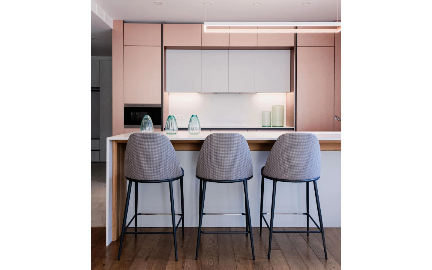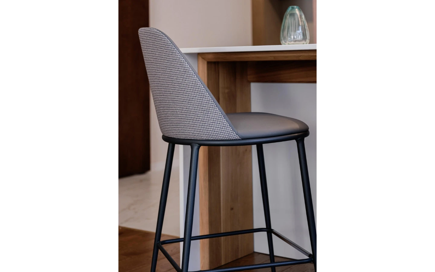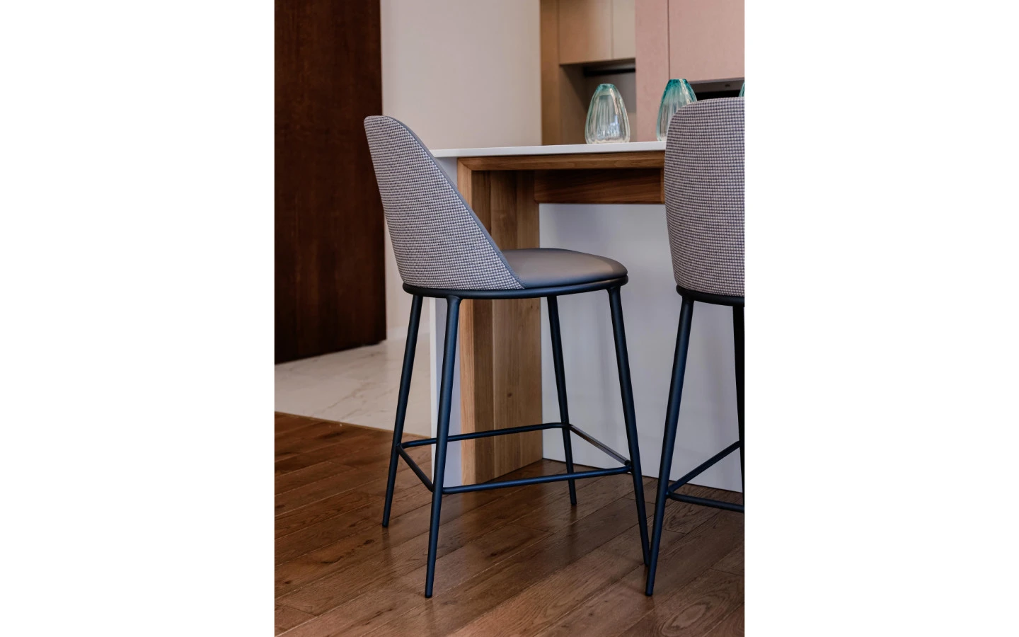 Бар столчета пред острова са модел Lea от MIDJ Italia. Тапицирани са в комбинация от естествена кожа и структурна дамаска в меко сиво и метална основа в графит.