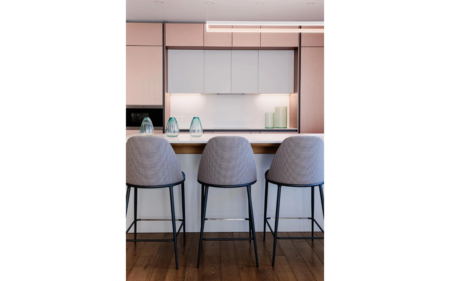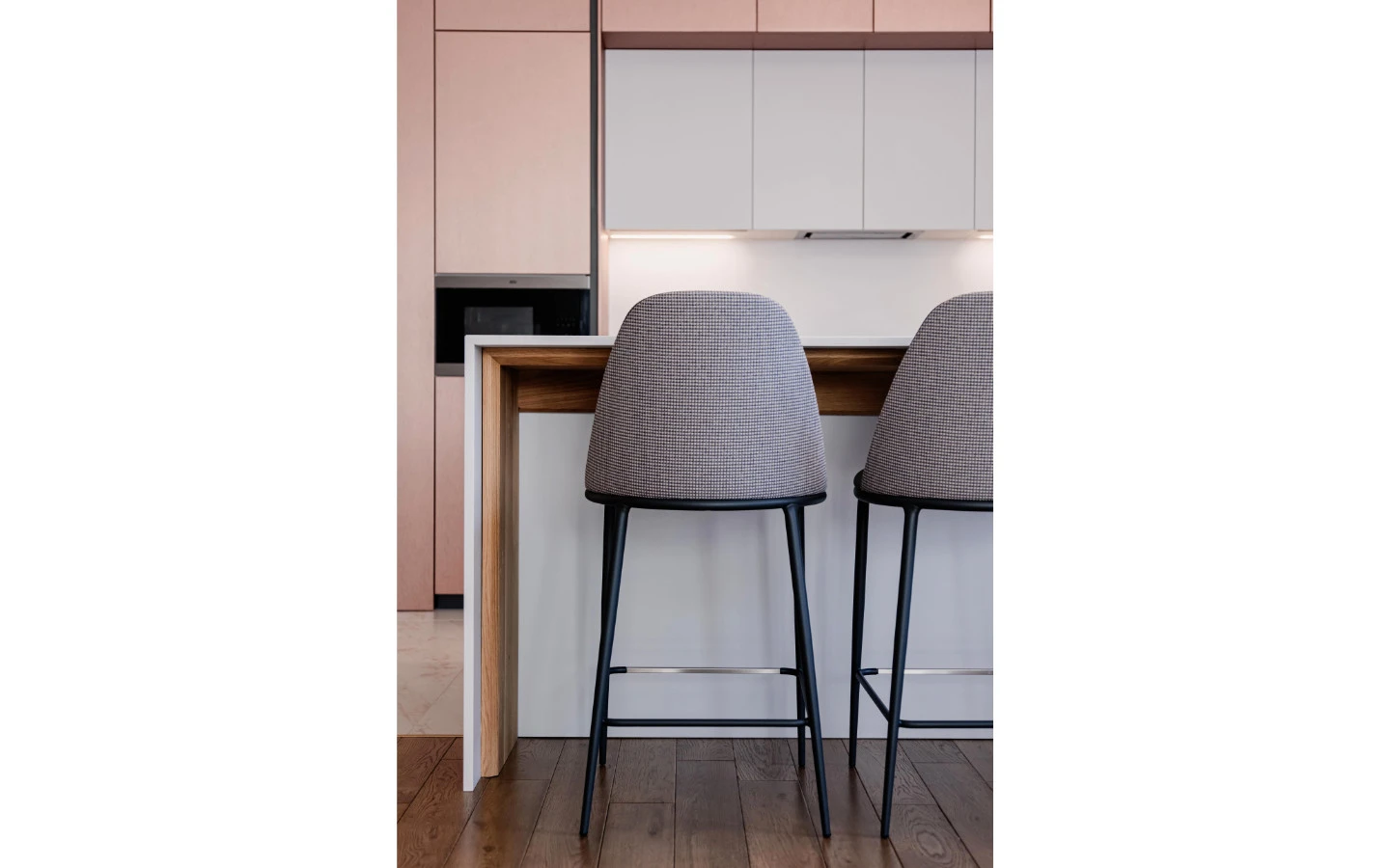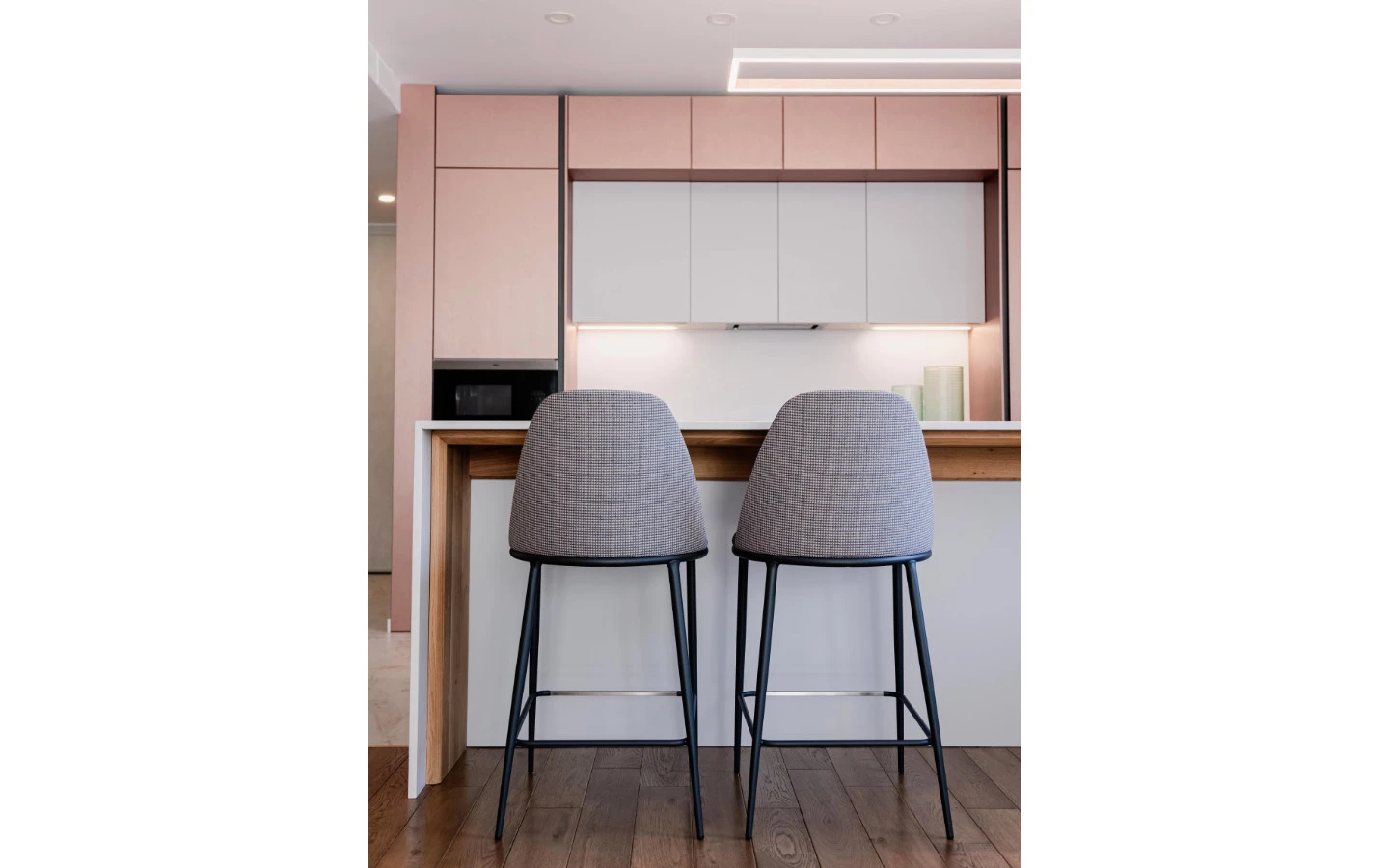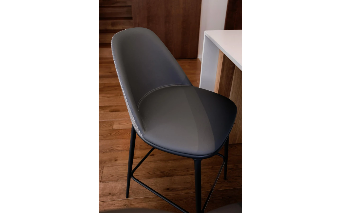 Бар столчета пред острова са модел Lea от MIDJ Italia. Тапицирани са в комбинация от естествена кожа и структурна дамаска в меко сиво и метална основа в графит.
