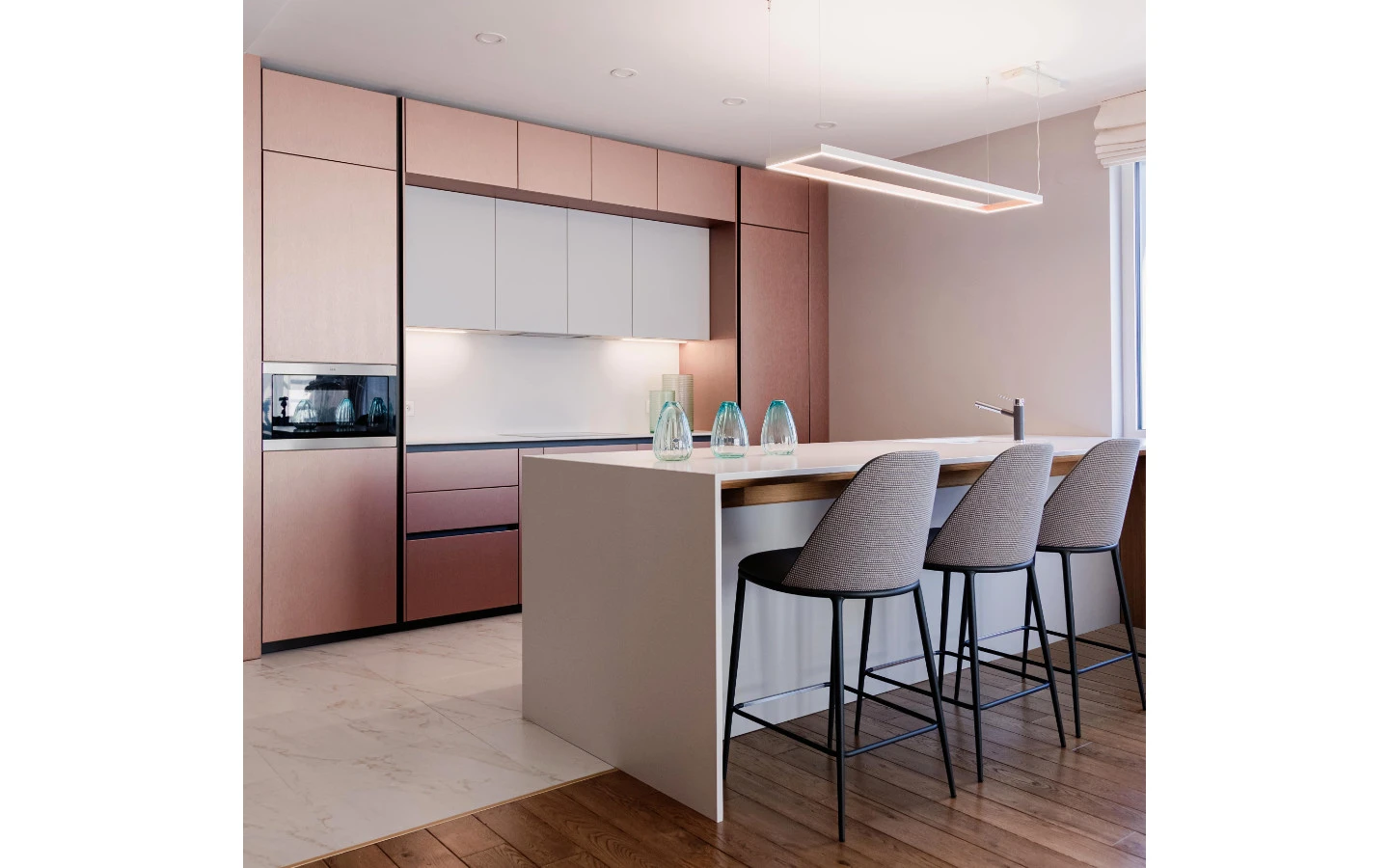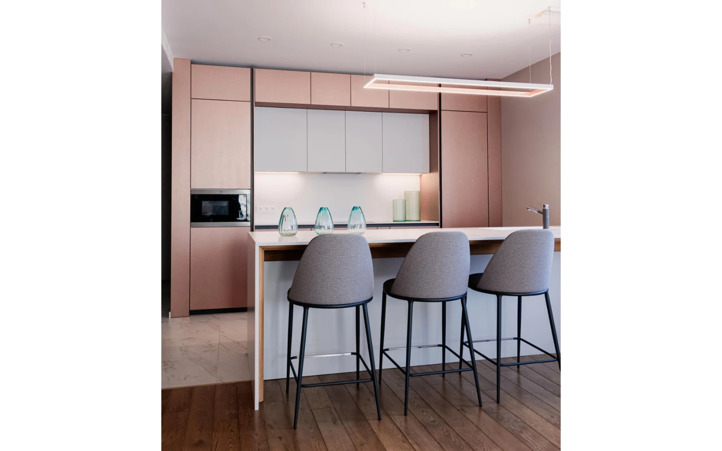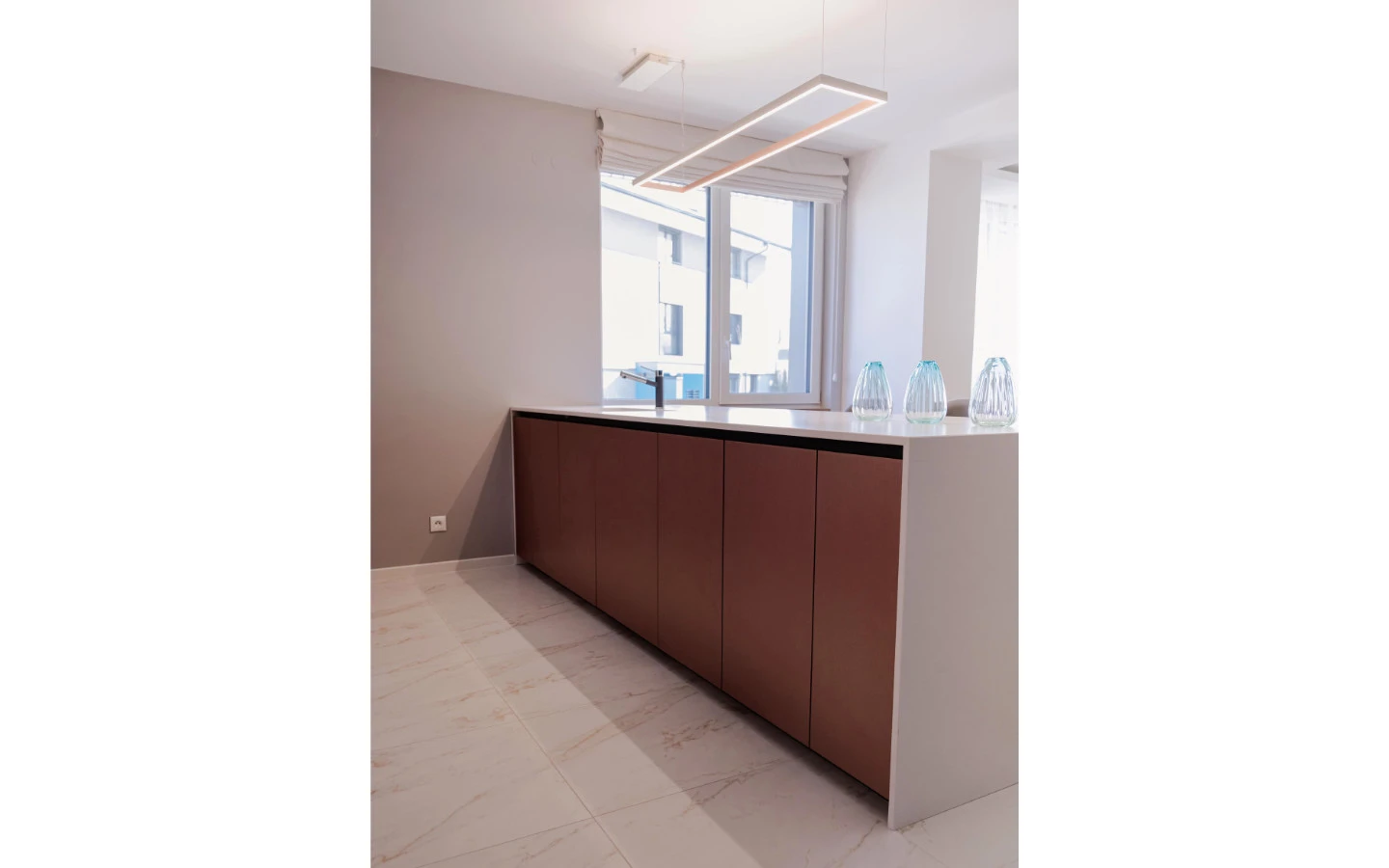 Дългият триметров кухненски остров осветихме с елегантното правоъгълно метално осветително тяло Flat на италианския производител Braga. Цветовете на метала на осветителното тяло – мед и бяло, подкрепиха тоновете на кухненската композиция.