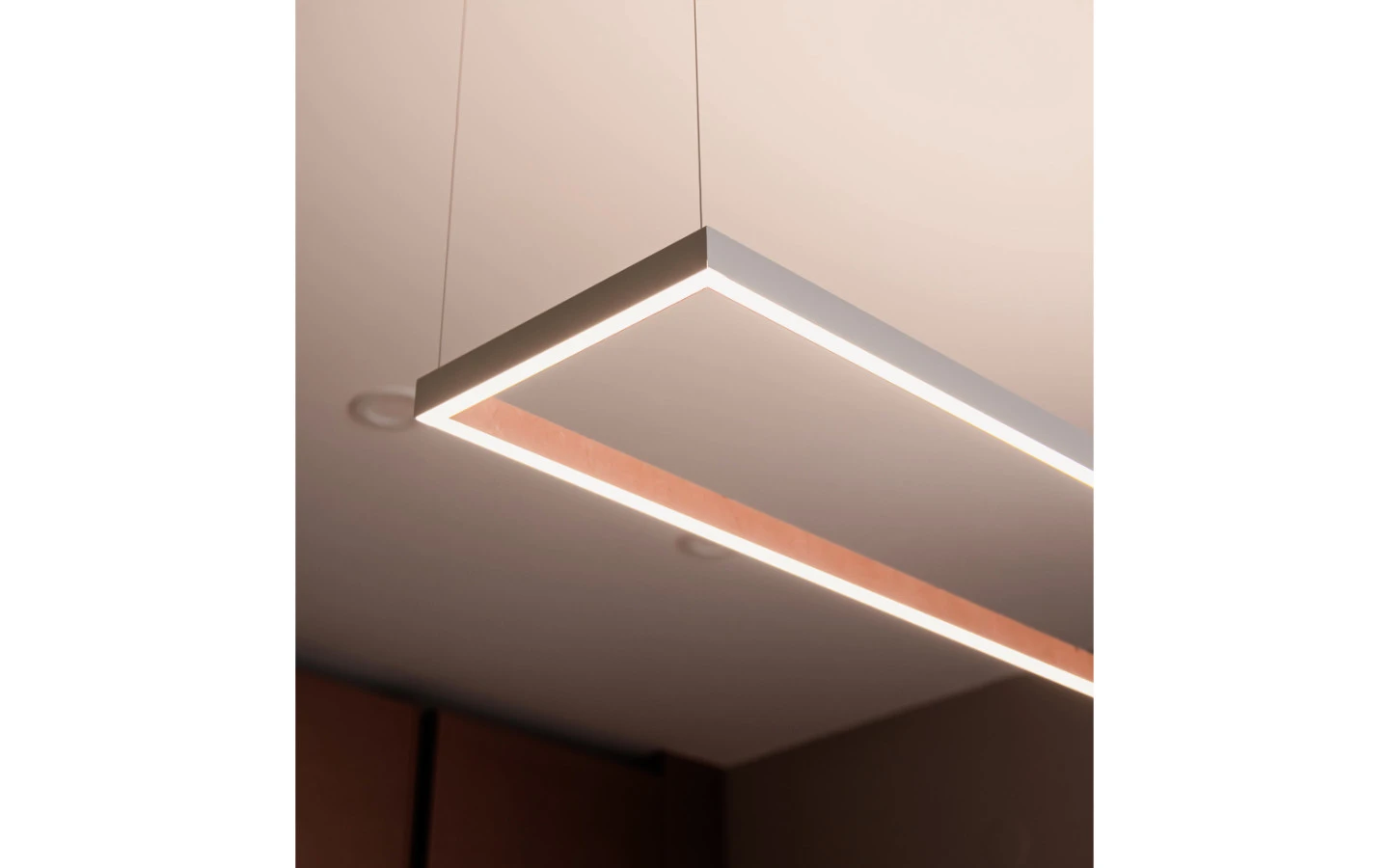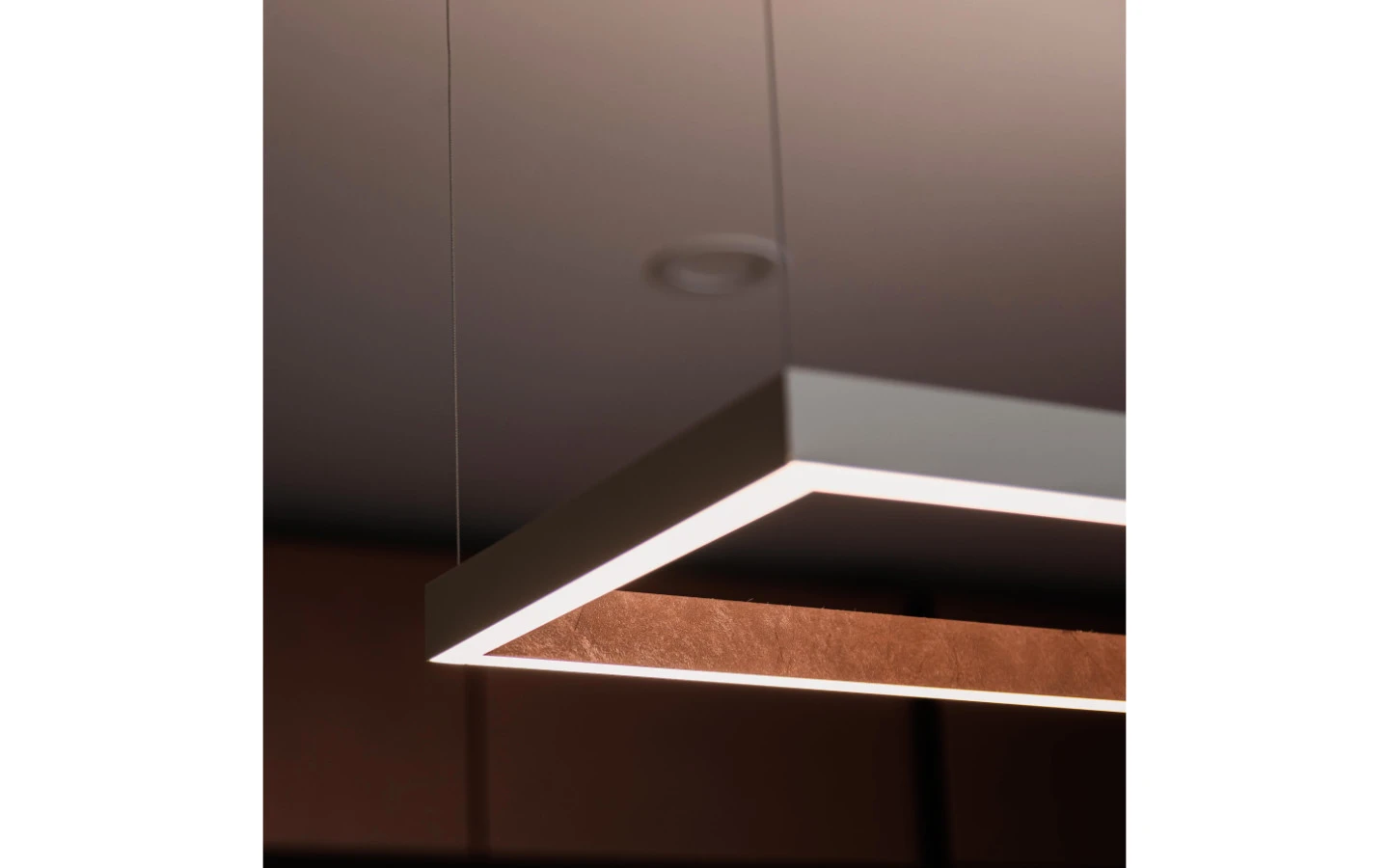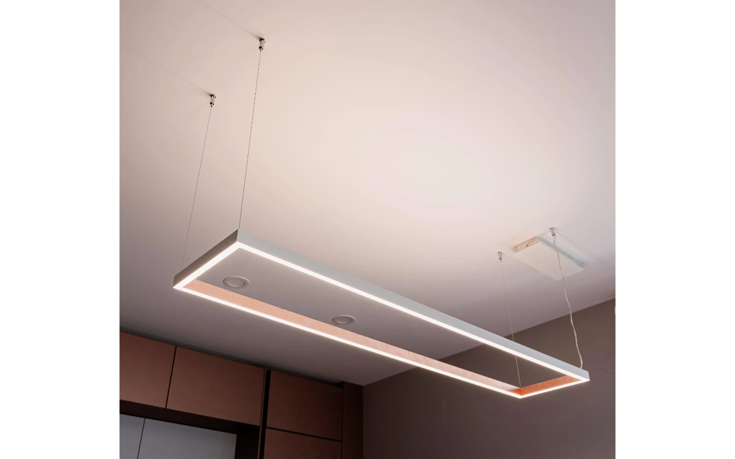 Дългият триметров кухненски остров осветихме с елегантното правоъгълно метално осветително тяло Flat на италианския производител Braga. Цветовете на метала на осветителното тяло – мед и бяло, подкрепиха тоновете на кухненската композиция.