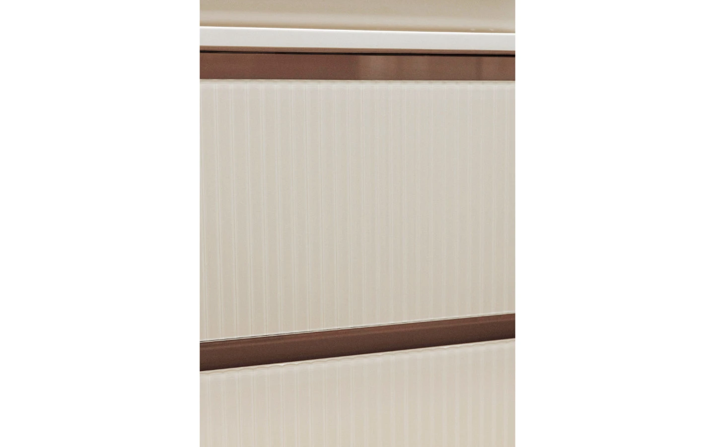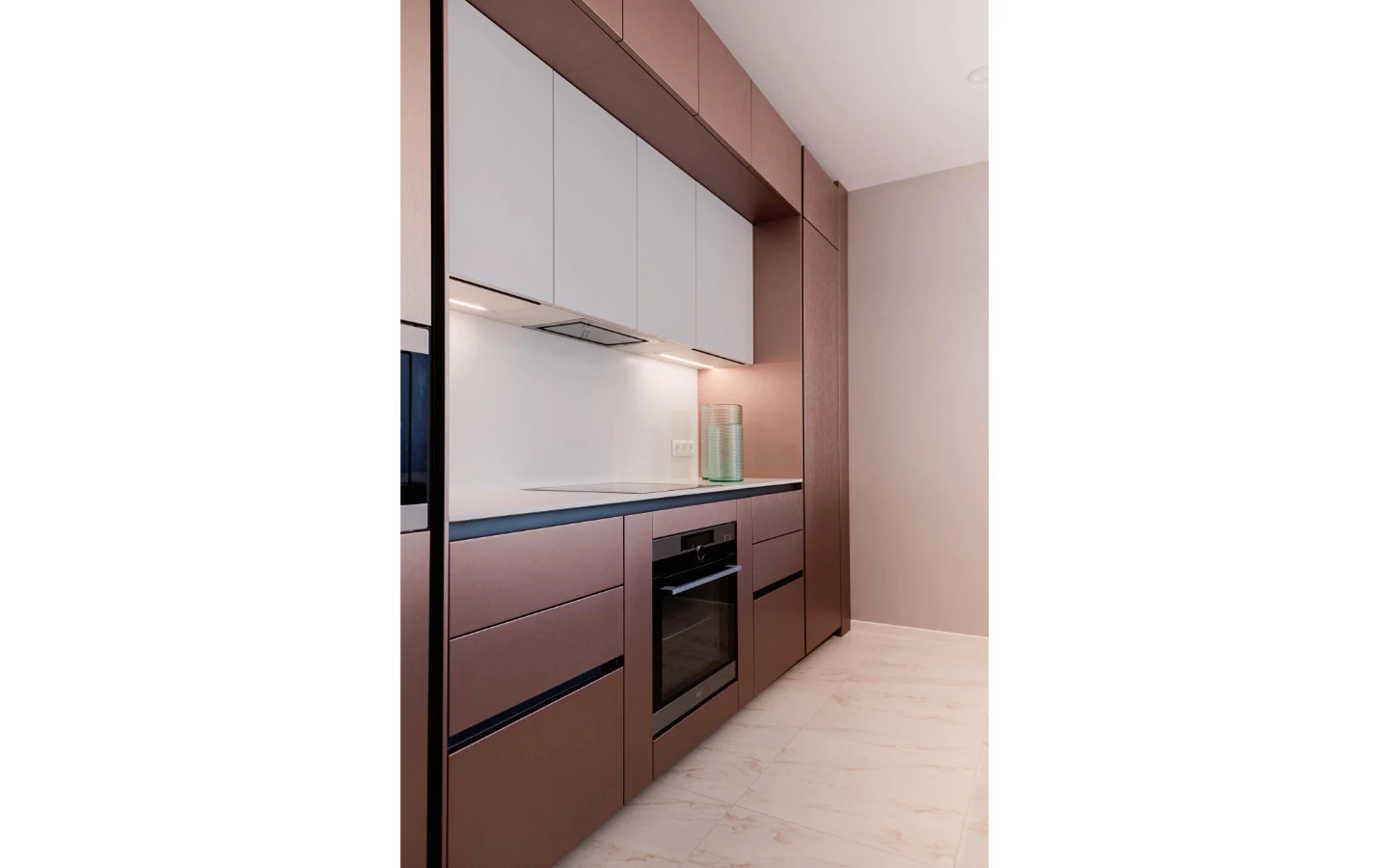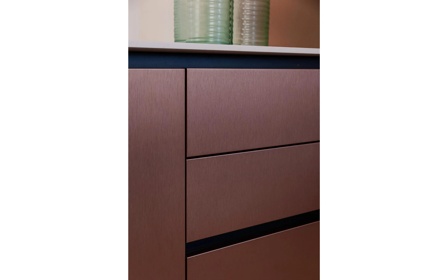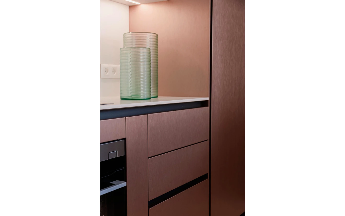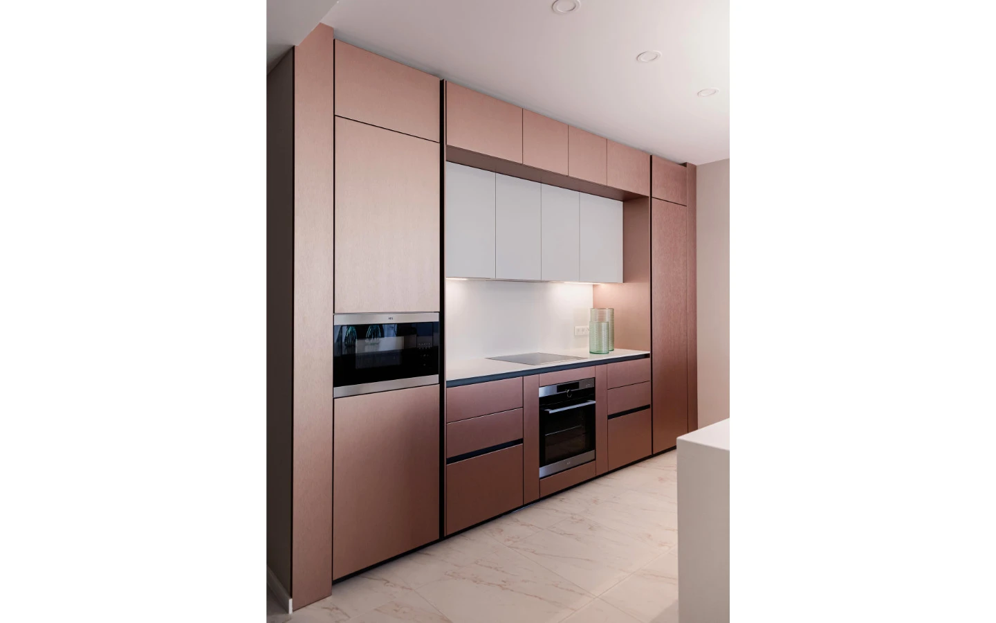 Деликатният меден финиш с фина релефна обработка на кухнята е графично подчертан от антрацитения метал на вградената дръжка и цокъл, и искрящото бяло на техническия камък в плота и стенната облицовка.