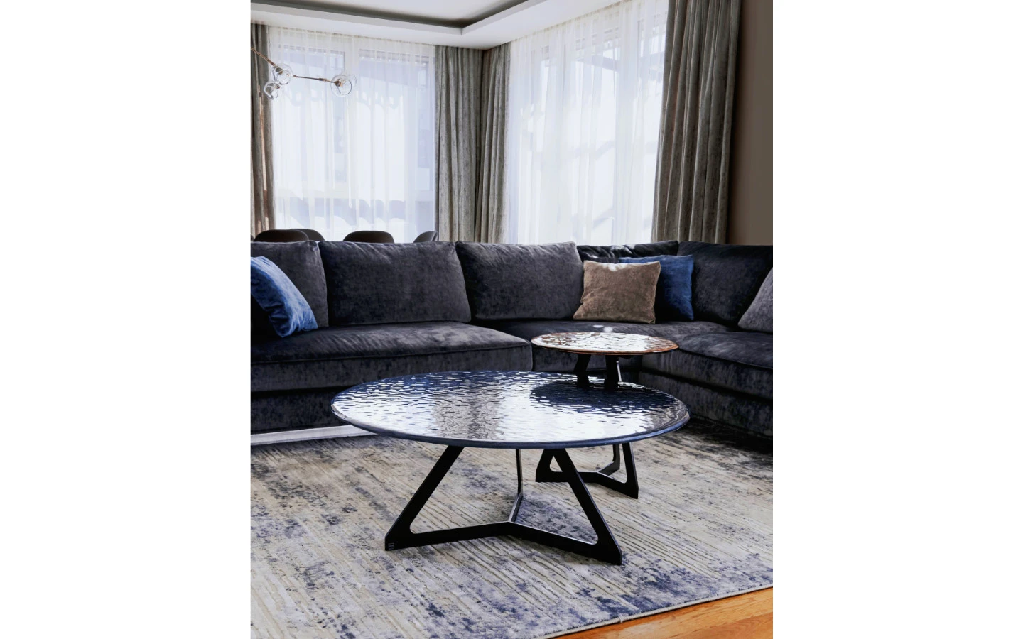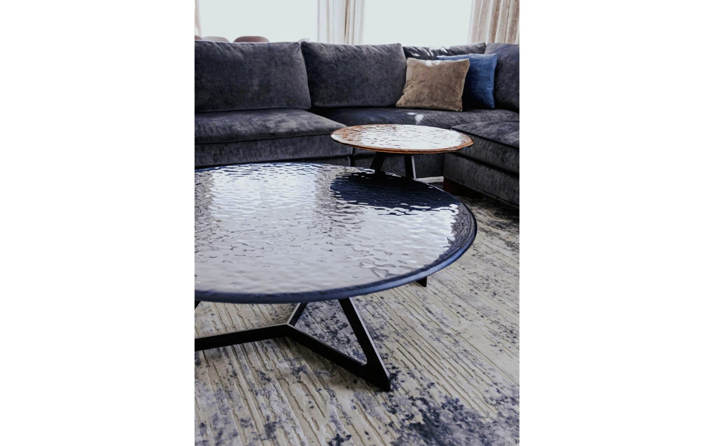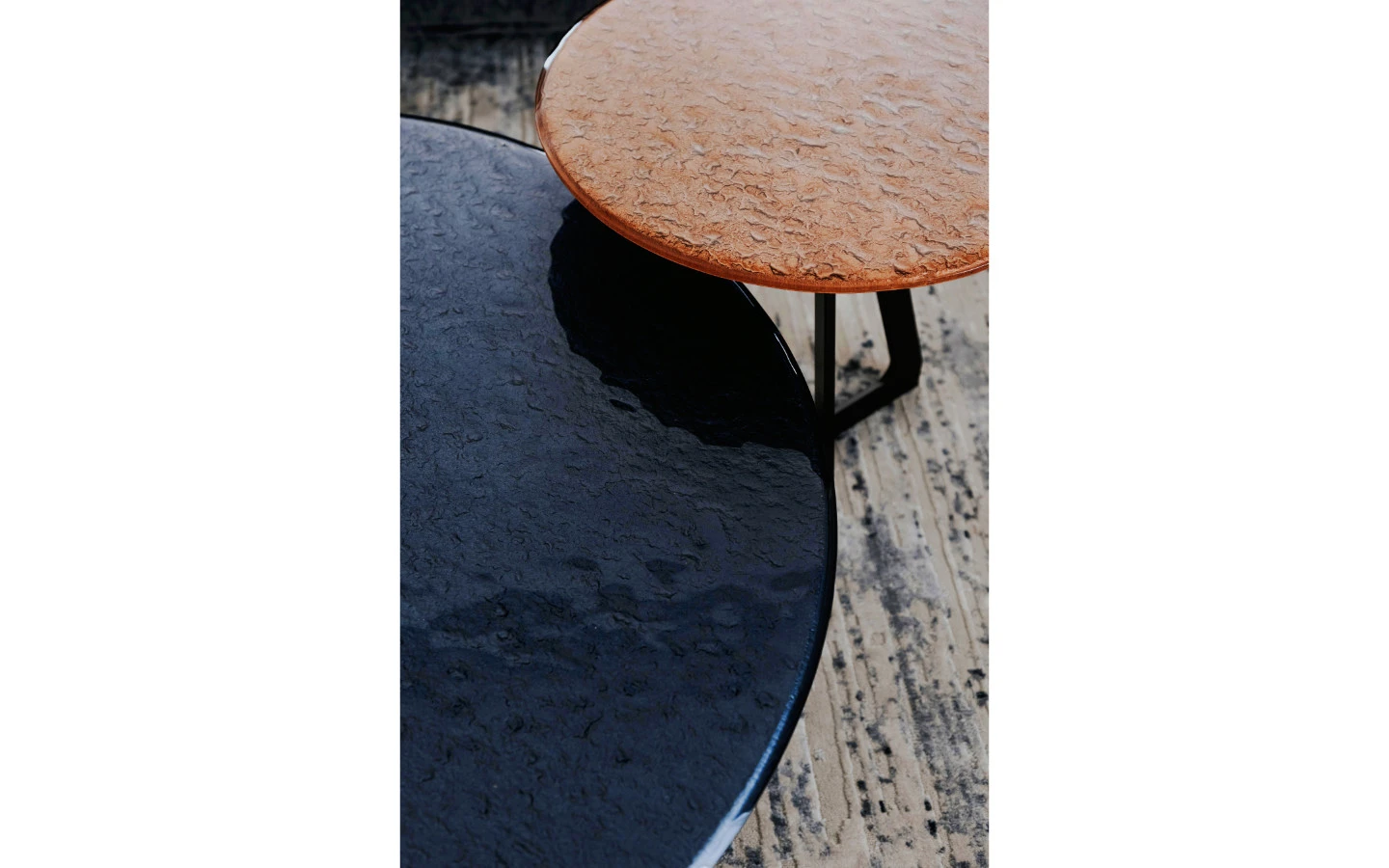 Двете ниски масички в центъра на групата за релакс са магнетична гледка! Гледка на спокойно езеро, което единствено FIAM Italia може да изработи от стъкло. Ниските маси са модел Lakes. Избраните тонове на стъклото са мед и дълбокото синьо на водите на езерото Комо.