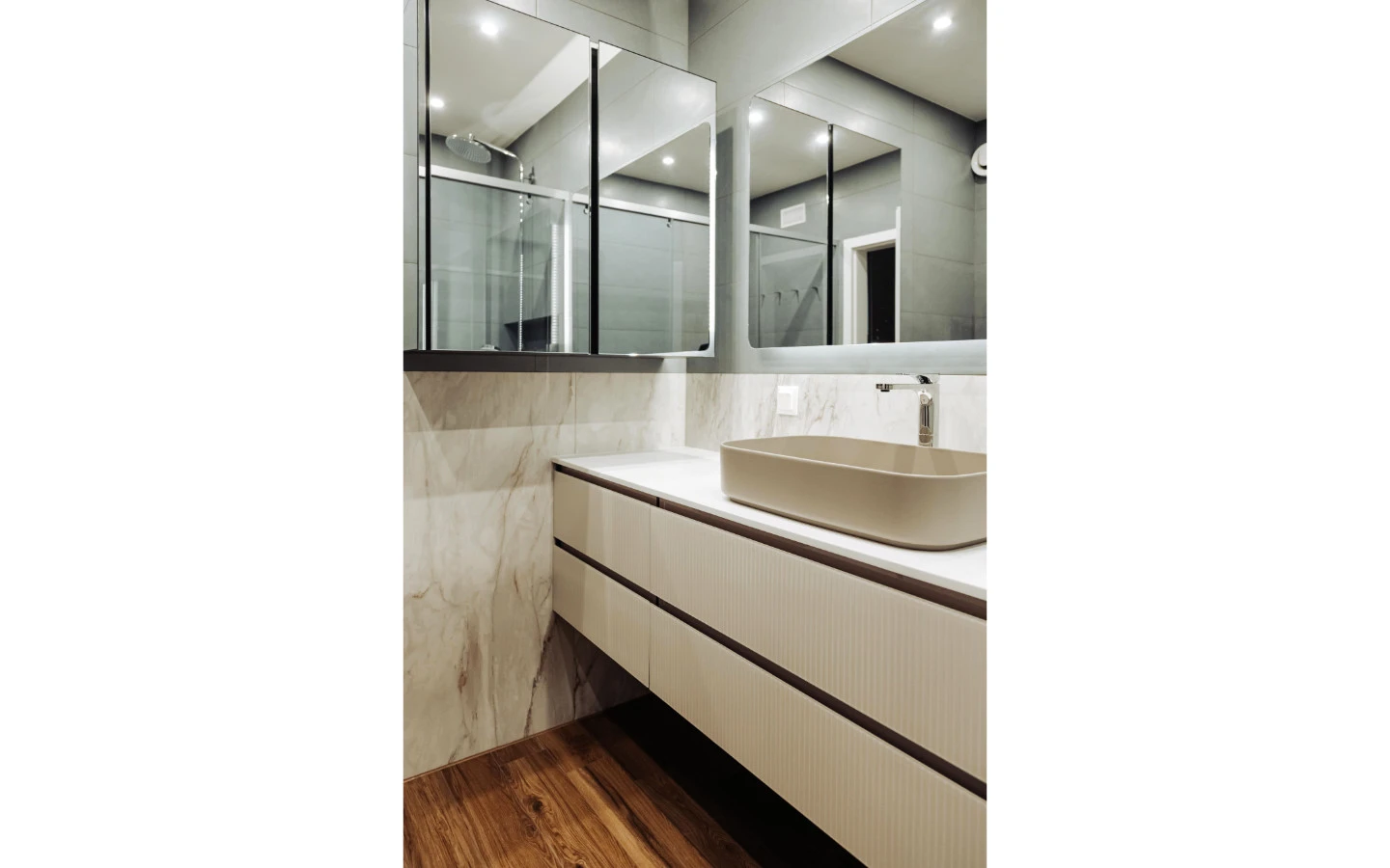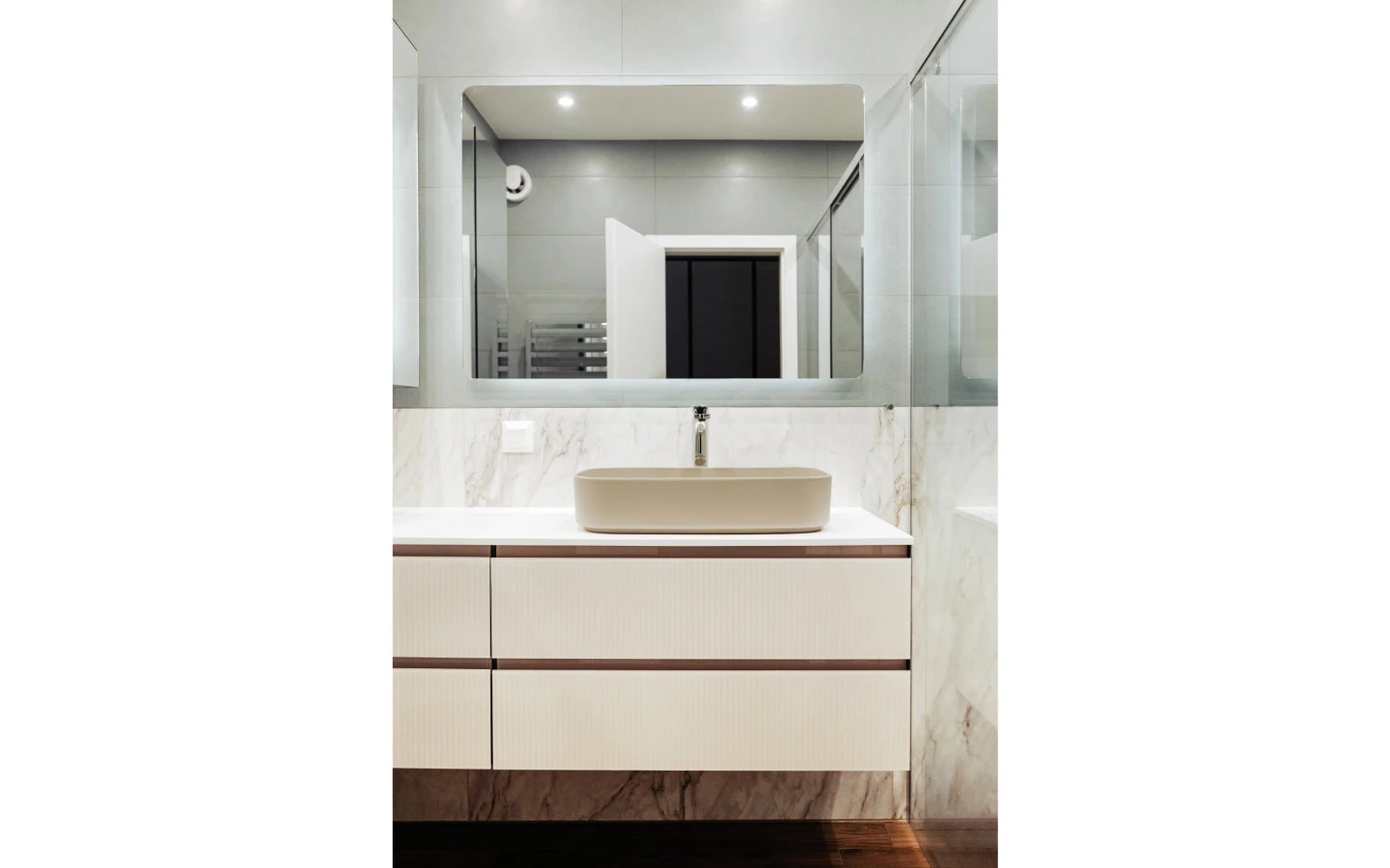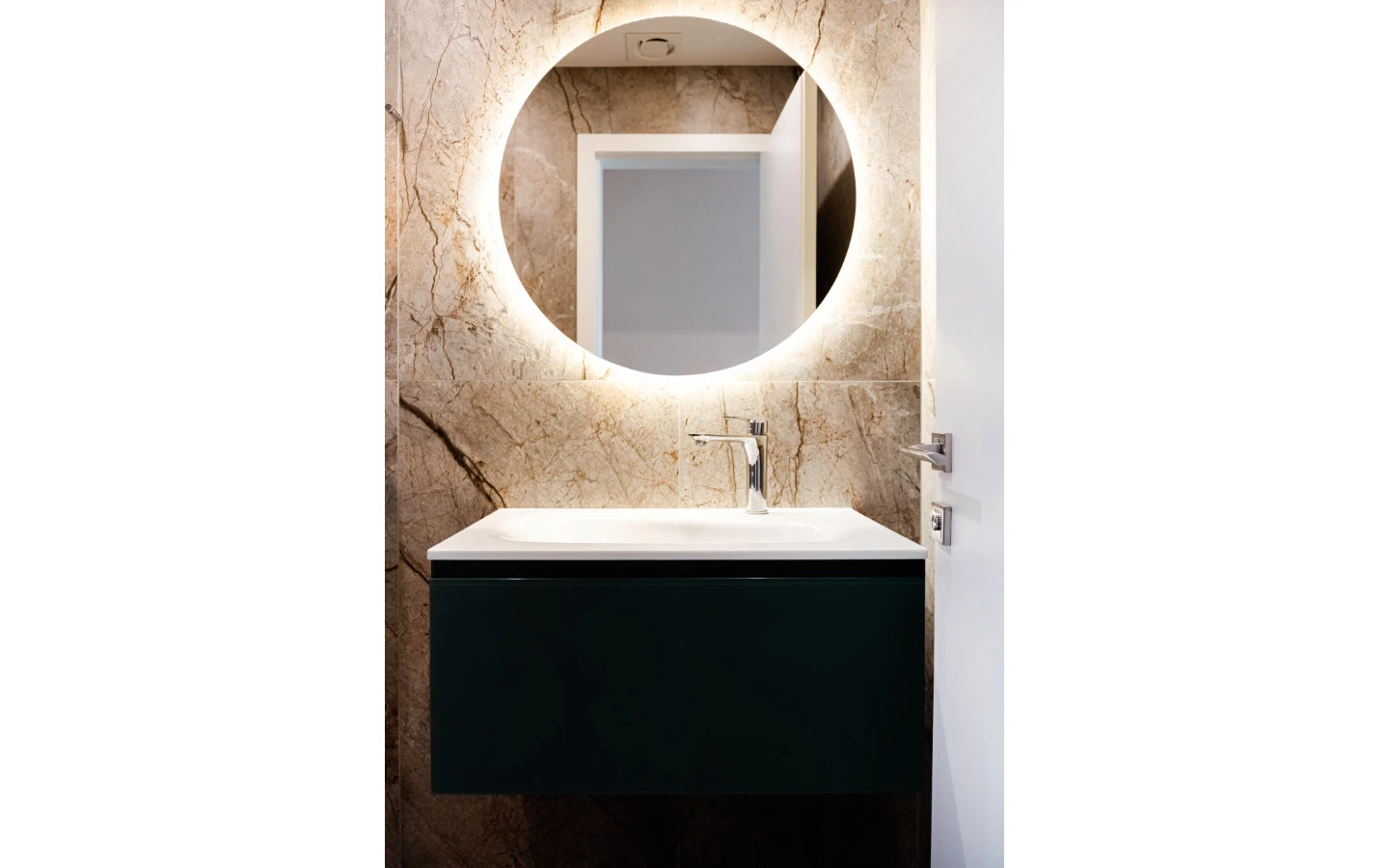 За всяка една от трите бани в хармония със стенните и подовите настилки селектирахме красиви шкафове от единственото по рода си производство на италианския производител за мебели за баня Artelinea.