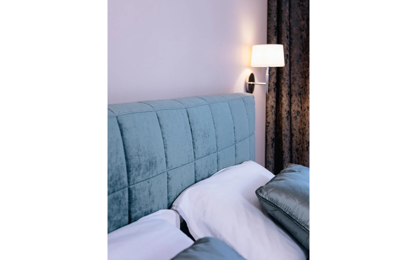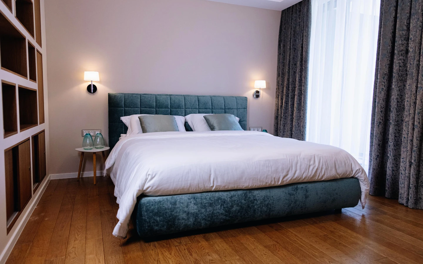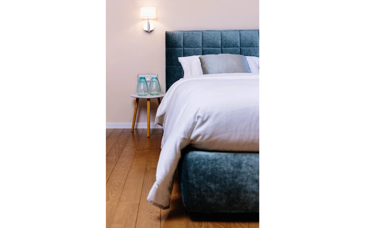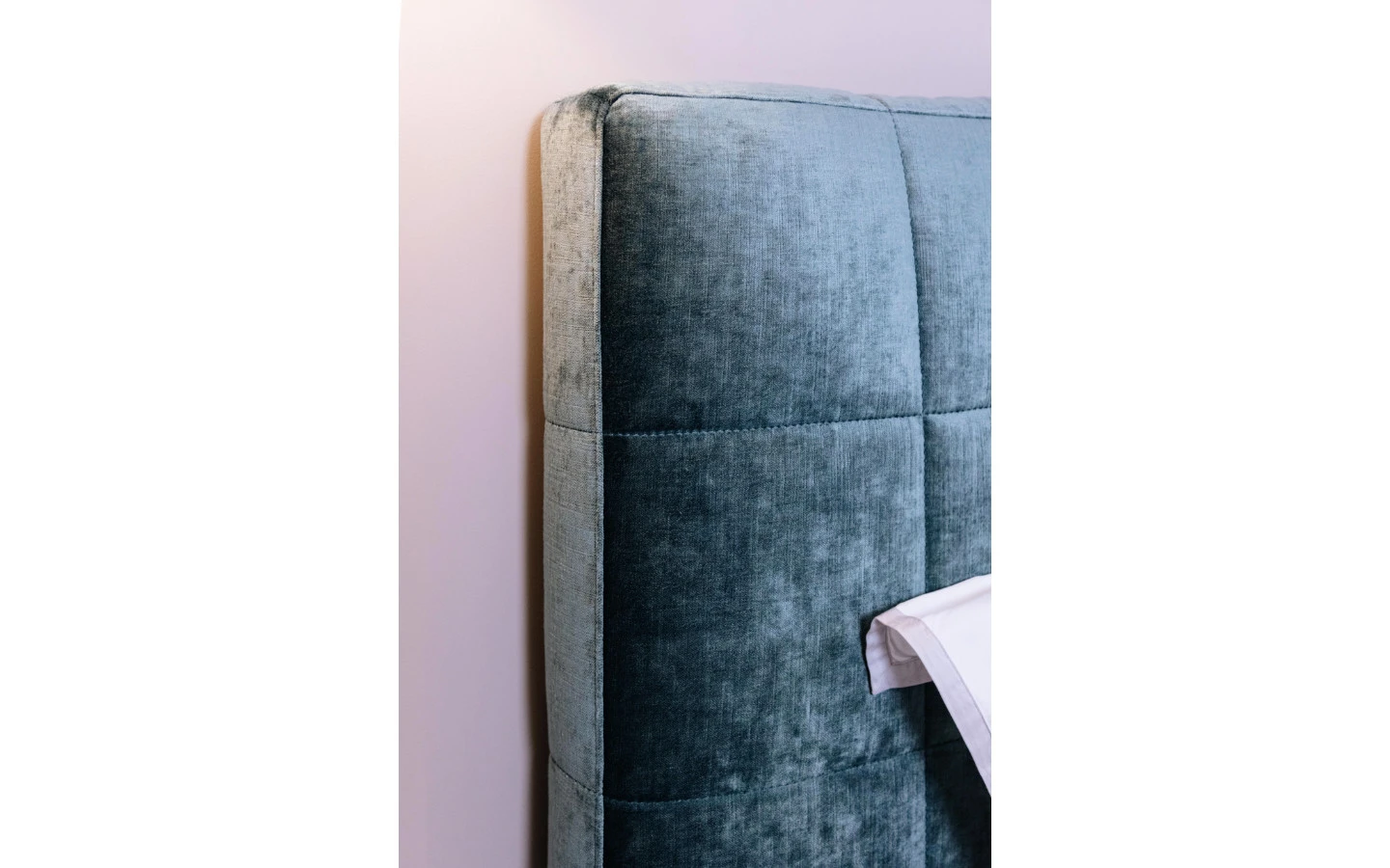 Елегантността и уюта на спалнята създадохме с графичността на леглото Crossing от италианския производител Flexteam, тапицирано в мека дамаска в цвета на топлия тюркоаз на морето при Капри.