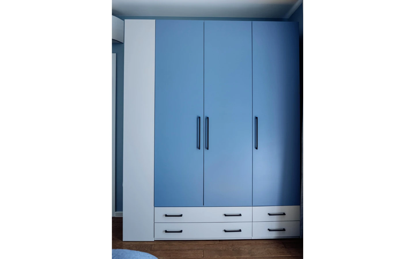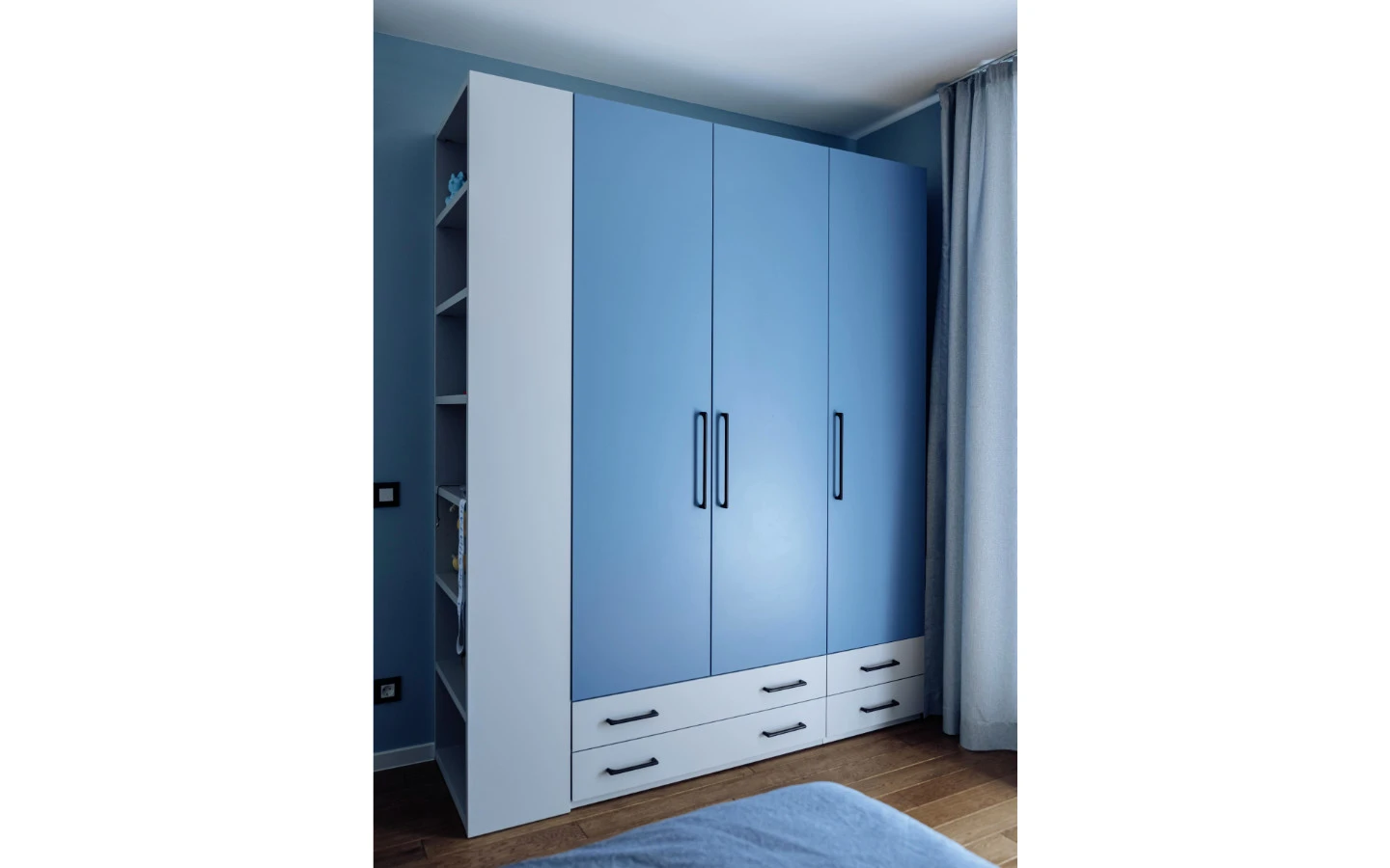За гардеробите в жилището се доверихме на безспорното качество, технология и дизайн от San Giacomo от Италия. Корпусите и вратите на гардеробите са в деликатен и елегантен финиш на светла мазилка с високи вертикални вградени метални дръжки в тъмно сив метал.