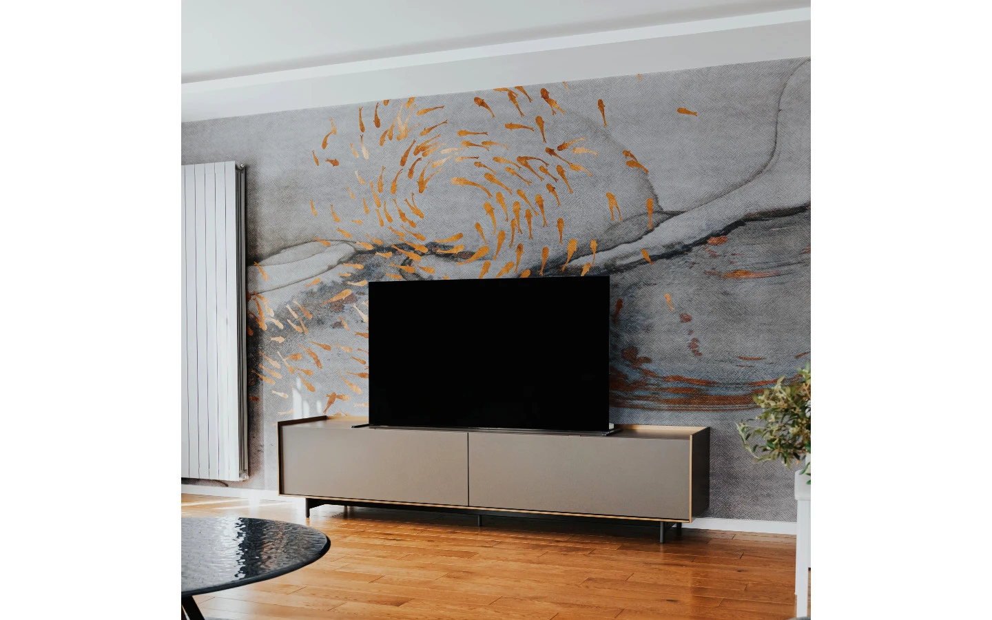 За фон на телевизионния шкаф избрахме стенно пано в богати сиви тонове с медени акценти. Това е тапет от Glamora – модел Flutti.