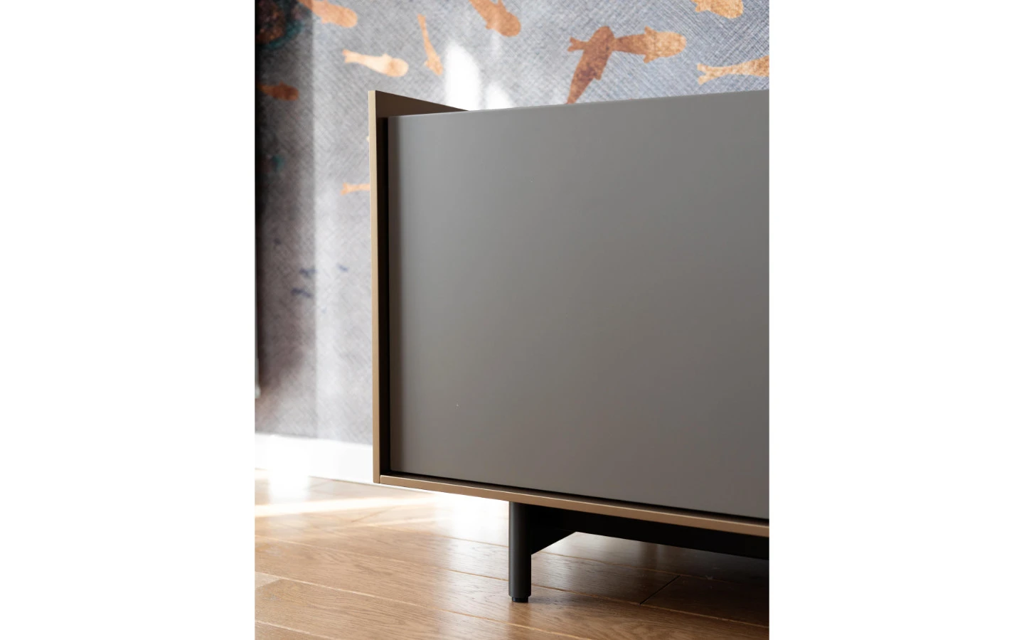 Линеареният телевизионен шкаф с вратички в опушен цвят, комбиниран със структура от топъл бронз, композирахме от колекцията Cabaret на безапелационния по отношение на качество на изделията си италиански производител на корпусна мебел San Giacomo.